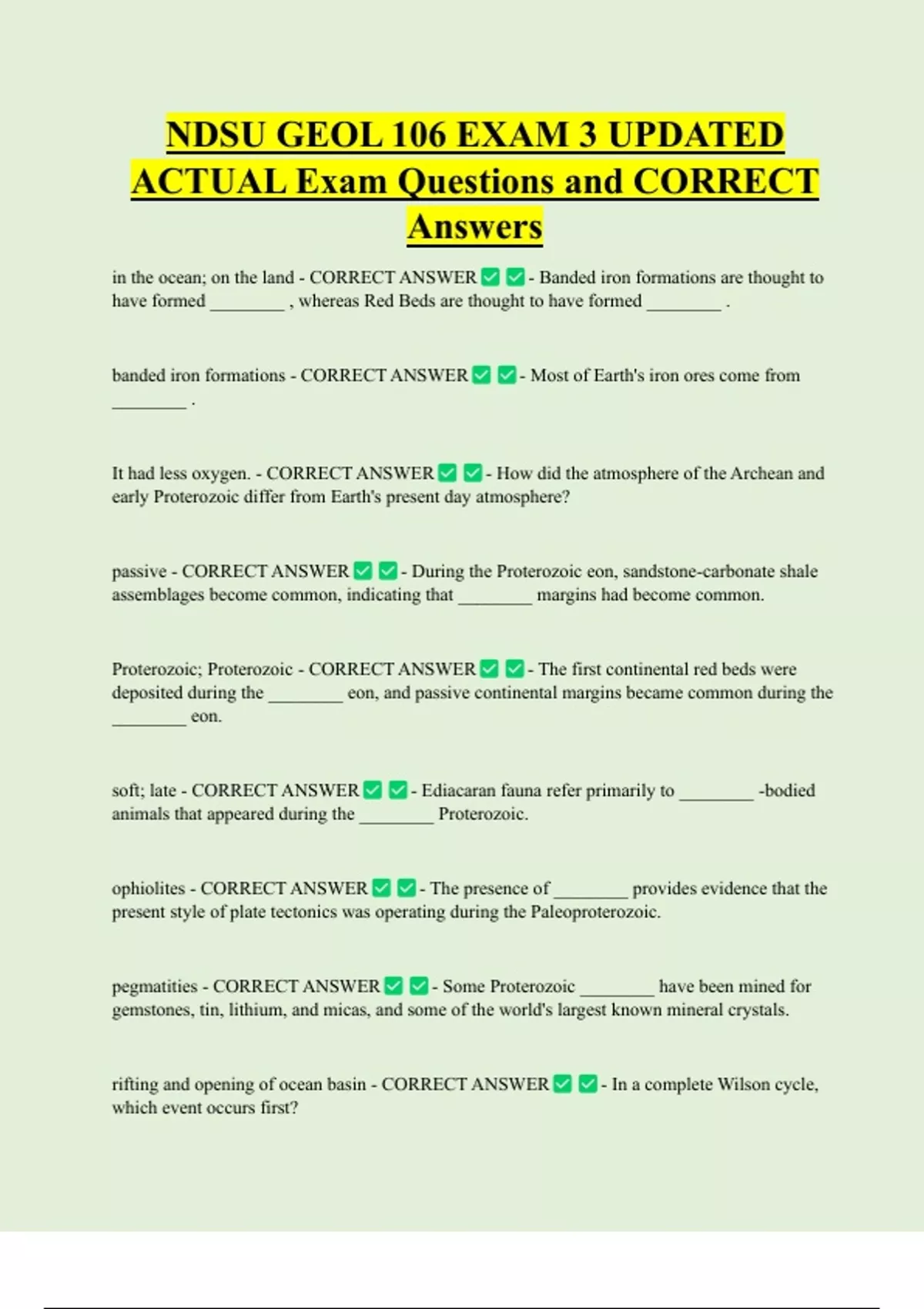 NDSU GEOL 106 EXAM 3 UPDATED ACTUAL Exam Questions and CORRECT Answers in the ocean; on the land - CORRECT ANSWER - Banded iron formations are thought to have formed ________ , whereas Red Beds are thought to have formed ________ . banded iron formations - CORRECT ANSWER - Most of Earth's iron ores come from ________