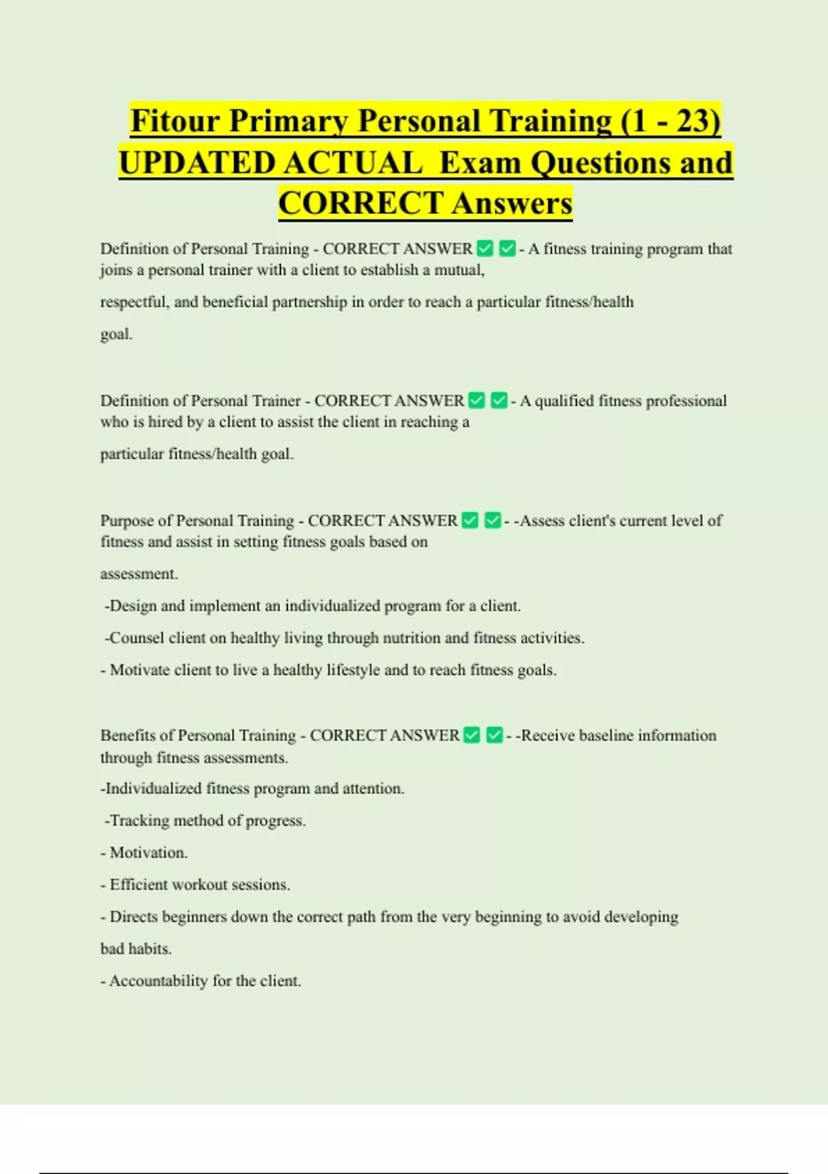 Fitour Primary Personal Training (1 - 23) UPDATED ACTUAL Exam Questions and CORRECT Answers Definition of Personal Training - CORRECT ANSWER - A fitness training program that joins a personal trainer with a client to establish a mutual, respectful, and beneficial partnership in order to reach a particular fitness/health goal.