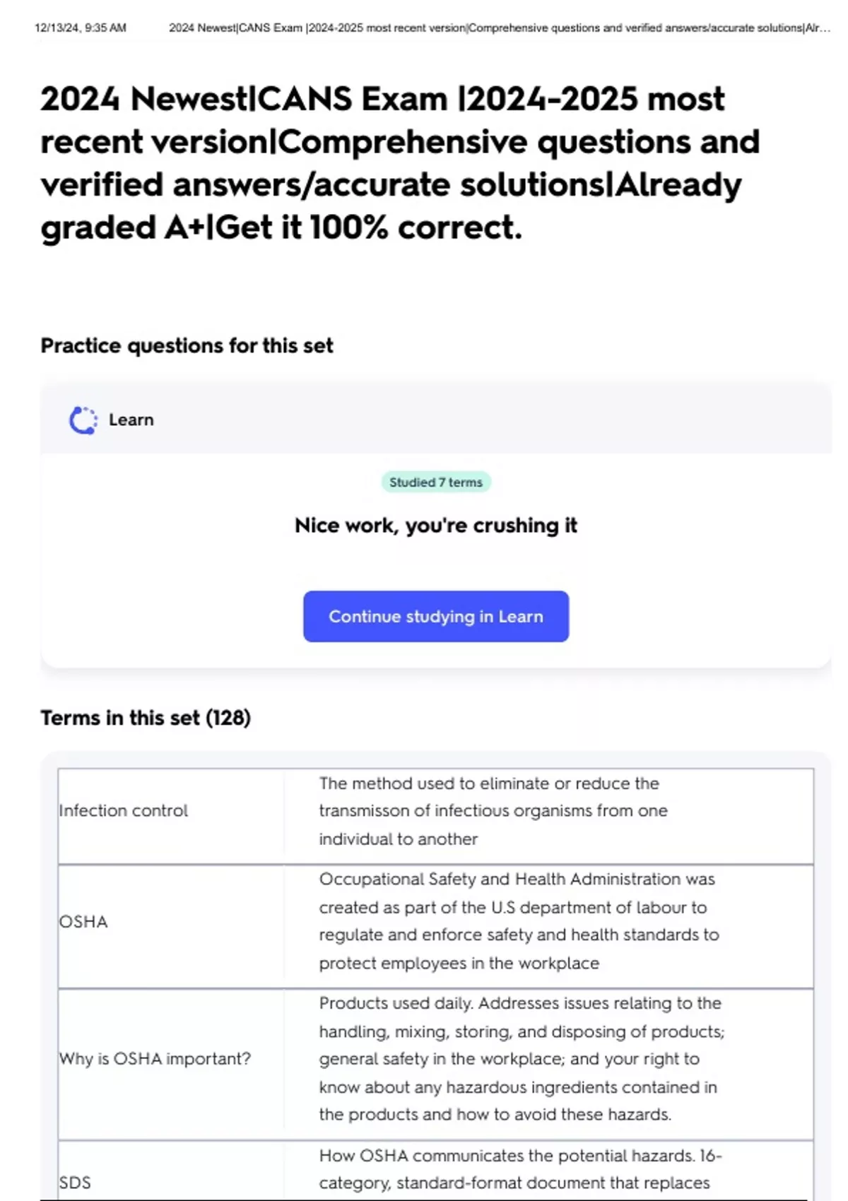 , 12/13/24, 9:35 AM 2024 Newest|CANS Exam |2024-2025 most recent version|Comprehensive questions and verified answers/accurate solutions|Alr…