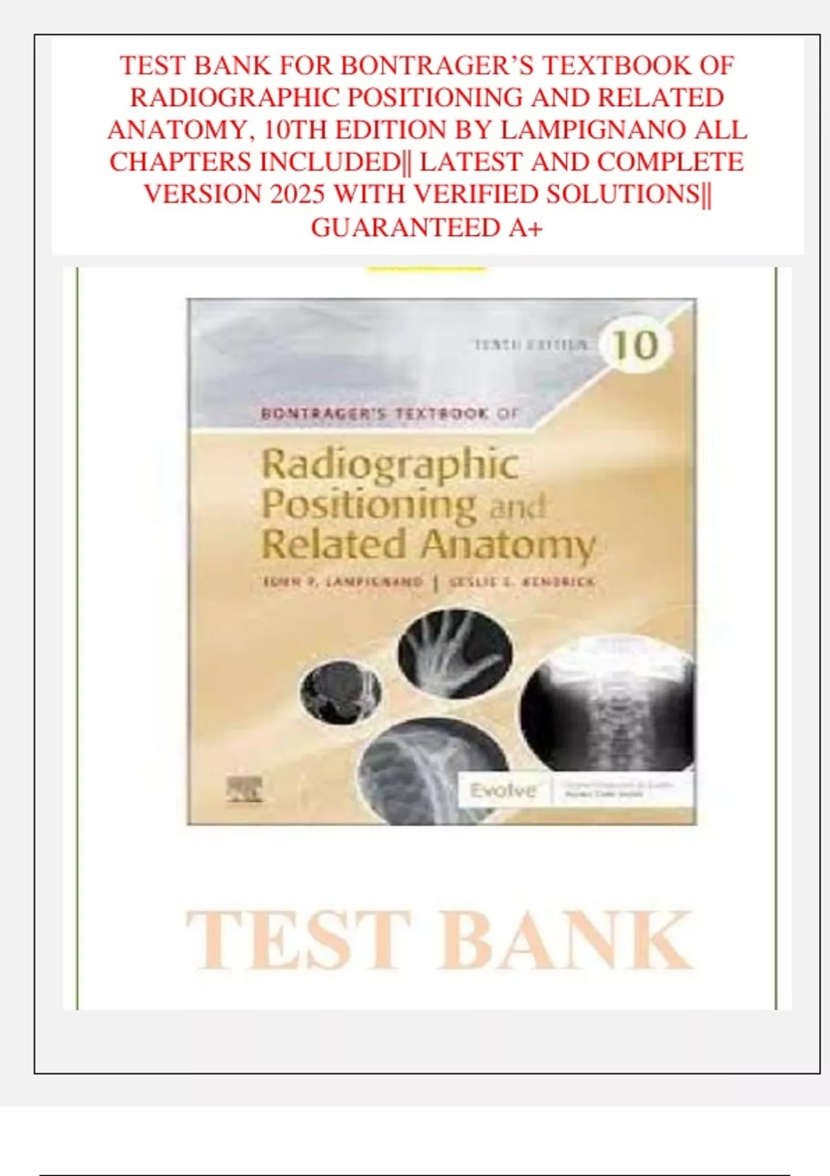 TEST BANK FOR BONTRAGER’S TEXTBOOK OF RADIOGRAPHIC POSITIONING AND RELATED ANATOMY, 10TH EDITION BY LAMPIGNANO ALL CHAPTERS INCLUDED|| LATEST AND COMPLETE VERSION 2025 WITH VERIFIED SOLUTIONS|| GUARANTEED A+