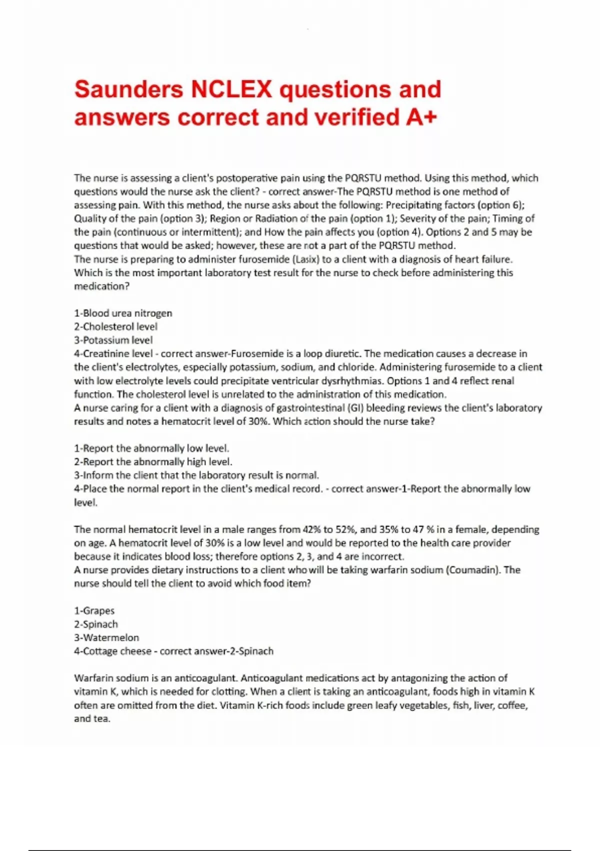 Saunders NCLEX questions and answers correct and verified A+Saunders NCLEX questions and answers correct and verified A+ The nurse is assessing a client's postoperative pain using the PQRSTU method. Using this method, which questions would the nurse ask the client? - correct answer-The PQRSTU method is one method of assessing pain. With this method, the nurse asks about the following: Precipitating factors (option 6); Quality of the pain (option 3); Region or Radiation of the pain (option 1); Severity of the pain; Timing of the pain (continuous or intermittent); and How the pain affects you (option 4). Options 2 and 5 may be questions that would be asked; however, these are not a part of the PQRSTU method. The nurse is preparing to administer furosemide (Lasix) to a client with a diagnosis of heart failure. Which is the most important laboratory test result for the nurse to check before administering this medication? 1-Blood urea nitrogen 2-Cholesterol level 3-Potassium level 4-Creatinine level - correct answer-Furosemide is a loop diuretic. The medication causes a decrease in the client's electrolytes, especially potassium, sodium, and chloride. Administering furosemide to a client with low electrolyte levels could precipitate ventricular dysrhythmias. Options 1 and 4 reflect renal function. The cholesterol level is unrelated to the administration of this medication. A nurse caring for a client with a diagnosis of gastrointestinal (GI) bleeding reviews the client's laboratory results and notes a hematocrit level of 30%. Which action should the nurse take? 1-Report the abnormally low level. 2-Report the abnormally high level. 3-Inform the client that the laboratory result is normal. 4-Place the normal report in the client's medical record. - correct answer-1-Report the abnormally low level. The normal hematocrit level in a male ranges from 42% to 52%, and 35% to 47 % in a female, depending on age. A hematocrit level of 30% is a low level and would be reported to the health care provider because it indicates blood loss; therefore options 2, 3, and 4 are incorrect. A nurse provides dietary instructions to a client who will be taking warfarin sodium (Coumadin). The nurse should tell the client to avoid which food item? 1-Grapes 2-Spinach 3-Watermelon 4-Cottage cheese - correct answer-2-Spinach Warfarin sodium is an anticoagulant. Anticoagulant medications act by antagonizing the action of vitamin K, which is needed for clotting. When a client is taking an anticoagulant, foods high in vitamin K often are omitted from the diet. Vitamin K-rich foods include green leafy vegetables, fish, liver, coffee, and tea. A client who has been receiving total parenteral nutrition (TPN) by way of a central venous access device complains of chest pain and dyspnea. The nurse quickly assesses the client's vital signs and notes that the pulse rate has increased and the blood pressure has dropped. The nurse determines that the client is most likely experiencing which problem? 1-Sepsis 2-Air embolism 3-Fluid overload 4-Fluid imbalance - correct answer-2-Air embolism The signs and symptoms of air embolism include chest pain, dyspnea, hypoxia, anxiety, tachycardia, and hypotension. The nurse also may hear a loud churning sound over the pericardium on auscultation of the client's chest. The signs and symptoms of sepsis include fever, chills, and general malaise. Fluid overload causes increased intravascular volume, which increases the blood pressure and the pulse rate as the heart tries to pump the extra fluid volume. Fluid overload also causes neck vein distention and shifting of fluid into the alveoli, resulting in lung crackles. The signs and symptoms of a fluid imbalance depend on the type of imbalance the client is experiencing. A client who is receiving intravenous (IV) fluid therapy complains of burning and a feeling of tightness at the IV insertion site. On assessment, the nurse detects coolness and swelling at the site and notes that the IV rate has slowed. The nurse determines that which complication has occurred? - correct answer-1-Infection 2-Phlebitis 3-Infiltration 4-Thrombosis An infiltrated IV line is one that has dislodged from the vein and is lying in subcutaneous tissue. Pallor, coolness, and swelling at the IV site result when IV fluid is deposited in the subcutaneous tissue. When the pressure in the tissues exceeds the pressure in the tubing, the flow of IV solution will slow down or stop. The corrective action is to remove the catheter and start a new IV line at another site. The conditions identified in options 1, 2, and 4 are likely to be accompanied by warmth at the site, not coolness. A nurse provides instructions to a preoperative client about the use of an incentive spirometer. The nurse determines that the client needs further instruction if the client indicates that he or she will take which action? 1-Sit upright when using the device. 2-Inhale slowly, maintaining a constant flow. 3-Place the lips completely over the mouthpiece. 4-After maximal inspiration, hold the breath for 10 seconds and then exhale. - correct answer-4-After maximal inspiration, hold the breath for 10 seconds and then exhale. For optimal lung expansion with the incentive spirometer, the client should assume a semi-Fowler's or high Fowler's position. The mouthpiece should be covered completely and tightly while the client inhales slowly, with a constant flow through the unit. When maximal inspiration is reached, the client should hold the breath for 2 or 3 seconds and then exhale slowly The nurse is monitoring a client who has a closed chest tube drainage system. The nurse notes fluctuation of the fluid level in the water-seal chamber during inspiration and expiration. On the basis of this finding, the nurse should make which interpretation? 1-There is a leak in the system. 2-The chest tube is functioning as expected. 3-The amount of suction needs to be decreased. 4-The occlusive dressing at the insertion site needs