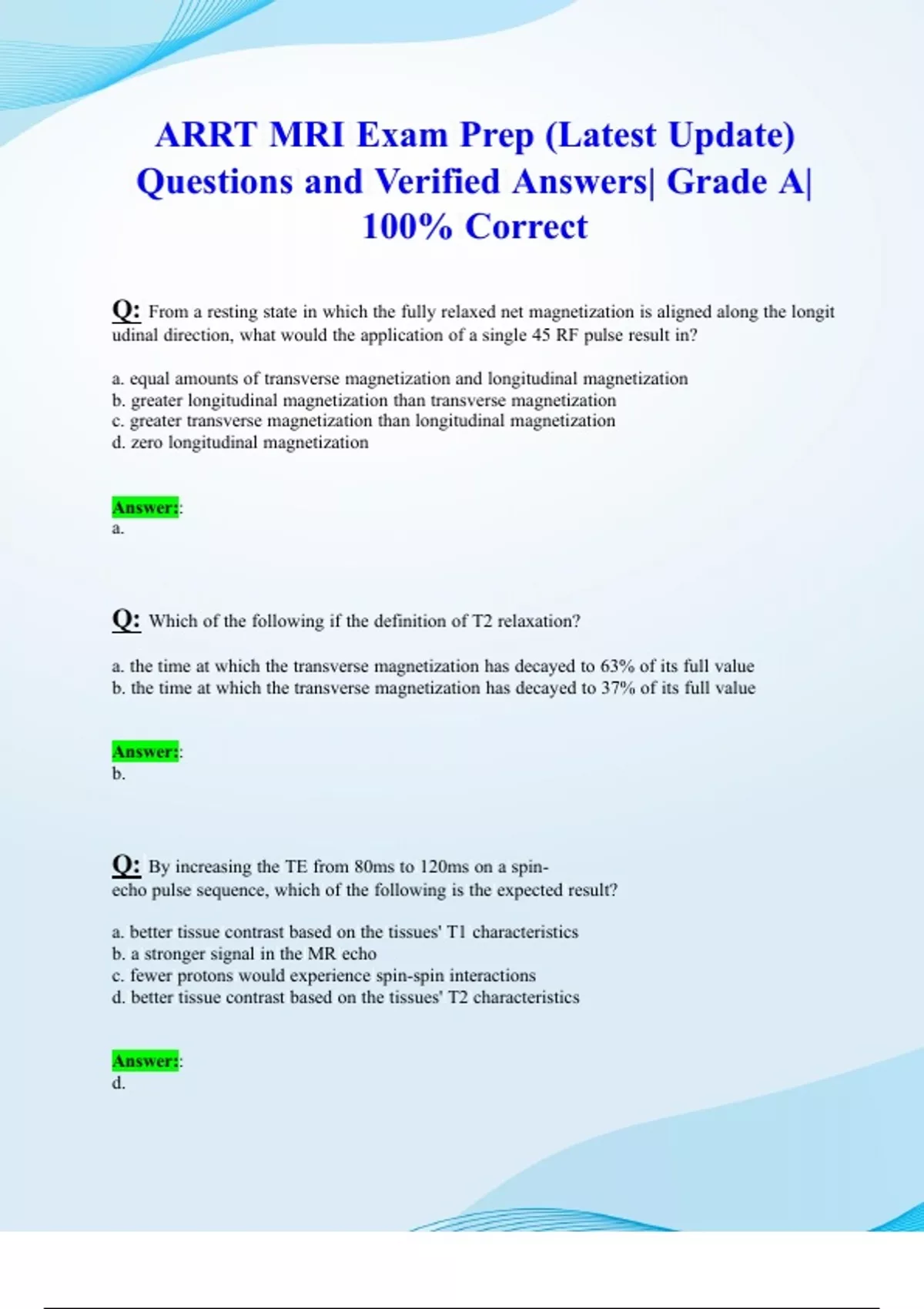 ARRT MRI Exam Prep (Latest 2024/ 2025 Update) Questions and Verified Answers| Grade A| 100% Correct Q: From a resting state in which the fully relaxed net magnetization is aligned along the longitudinal direction, what would the application of a single 45 RF pulse result in? a. equal amounts of transverse magnetization and longitudinal magnetization b. greater longitudinal magnetization than transverse magnetization c. greater transverse magnetization than longitudinal magnetization d. zero longitudinal magnetization Answer:: a. Q: Which of the following if the definition of T2 relaxation? a. the time at which the transverse magnetization has decayed to 63% of its full value b. the time at which the transverse magnetization has decayed to 37% of its full value Answer:: b. Q: By increasing the TE from 80ms to 120ms on a spin-echo pulse sequence, which of the following is the expected result? a. better tissue contrast based on the tissues' T1 characteristics b. a stronger signal in the MR echo c. fewer protons would experience spin-spin interactions d. better tissue contrast based on the tissues' T2 characteristics Answer:: d. Q: If six successive 180 RF pulses are applied, following a 90 RF pulse, how many echoes will be formed? a. one b. two c. six d. eight Answer:: c. Q: If the six successive 180 RF pulses are applied, following a 90 RF pulse, echo ____ will contain the greatest signal? a. one b. three c. five d. six Answer:: a. Q: Using a spin-echo pulse sequence which generates two echoes, imagine a hypothetical tissue in which protons never experience spin-spin interactions. How does the signal from the first echo compare to the signal from the second echo? a. its frequency is higher b. its frequency is lower c. its the same size d. it is smaller in size Answer:: c. Q: What is the time from the 180 RF pulse to the echo? a. TE b. TR c. 2.0 x TE d. 0.5 x TE Answer:: d. TE/2 TAU Q: Which of the following dephasing mechanisms is NOT rephased by a 180 RF pulse? a. magnetic susceptibility b. phase effects of a chemical shift c. spin-spin interactions d. magnetic field inhomogeneities Answer:: c. Q: Which of the following parameters controls the amount of contrast seen in an image due to T2 relaxation? a. TI b. TR c. TM d. TE Answer:: d. Q: The effect of an IV. administered paramagnetic contrast agent used in MRI is a shortening of a T1 relaxation time of the protons within any perfused tissue. A vascular lesion would appear ____ on a T1-W contrast-enhanced image as compared to its appearance on a T1-W unenhanced image. a. the same b. darker c. as a signal void d. brighter Answer:: d. Q: In a given MR system, the magnetization of protons within the patient precesses at 63.83MHz. Without the interference of any other system component, what is the expected result if the RF energy is applied at a frequency of 63.83 MHz? a. only the patient's protons in a sagittal slice will be disturbed by the external energy b. all of the patient's protons within range of the transmitting antenna will be disturbed by the external energy c. none of the patient's protons would be disturbed by the external energy d. only the patient's protons in a transverse slice will be disturbed by the external energy Answer:: b. Q: If the field strength experienced by a patient within an MR magnet is increased, the precessional frequency of the magnetization of the patient's protons will: a. increase b. reverse its spin direction c. remain unaffected d. decrease Answer:: a. Q: The energy used to form MR images is ____ the patient's tissues. a. attenuated by b. magnified by c. reflected off of d. released from