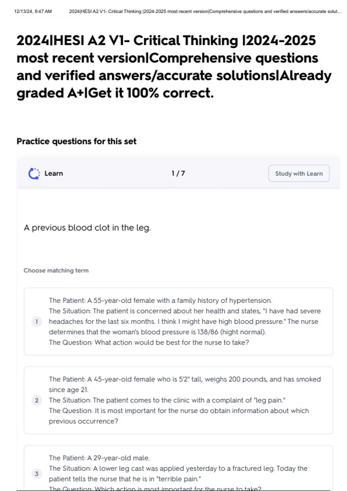 2024|HESI A2 V1- Critical Thinking | most recent version|Comprehensive questions and verified answers/accurate solutions|Already graded A+|Get it 100% correct. Practice questions for this set Learn 1 / 7 Study with Learn A previous blood clot in the leg. Choose matching term 1 The Patient: A 55-year-old female with a family history of hypertension. The Situation: The patient is concerned about her health and states, "I have had severe headaches for the last six months. I think I might have high blood pressure." The nurse determines that the woman's blood pressure is 138/86 (hight normal). The Question: What action would be best for the nurse to take? 2 The Patient: A 45-year-old female who is 5'2" tall, weighs 200 pounds, and has smoked since age 21. The Situation: The patient comes to the clinic with a complaint of "leg pain." The Question: It is most important for the nurse do obtain information about which previous occurrence? 3 The Patient: A 29-year-old male. The Situation: A lower leg cast was applied yesterday to a fractured leg. Today the patient tells the nurse that he is in "terrible pain." The Question: Which action is most important for the nurse to take? 4 The Patient: An 80-year-old male who has used continuous oxygen for the past three years. The Situation: While making a home visit, the wife tells the nurse that her husband was doing well on 2 liters of oxygen per minute until late night when he developed severe 12/13/24, 9:47 AM 2024|HESI A2 V1- Critical Thinking | most recent version|Comprehensive questions and verified answers/accurate solut… Terms in this set (30) The Patient: A 65-year-old man. The Situation- The family brings the patient to the emergency room because he just took an entire bottle of pills. The Question: What action should the nurse take first? Determine the patient's level of consciousness. The Patient: An 80-year- old male who has used continuous oxygen for the past three years. The Situation: While making a home visit, the wife tells the nurse that her husband was doing well on 2 liters of oxygen per minute until late night when he developed severe shortness of breath on the way to the bathroom. The Question: What action should the nurse take first? Assess the patient's oxygen saturation by pulse oximeter. The Patient: A 41-year-old male. The Situation: The patient is complaining of severe stomach pain and states that he has been "vomiting all the time." The Question: What should the nurse do first? Administer a prescribed pain medication. shortness of breath on the way to the bathroom. The Question: What action should the nurse take first? Don't know? 12/13/24, 9:47 AM 2024|HESI A2 V1- Critical Thinking | most recent version|Comprehensive questions and verified answers/accurate solut… The Patient: The wife of a wealthy owner of the town's bank. The Situation: The patient and her husband arrive on the unit. While orienting the patient to the hospital room, the nurse notices that the patient has placed a large amount of cash and some expensive earrings in the drawer of the bedside table. The Question: What is the best action for the nurse to take? Advise the patient to have her husband take the items home when he leaves. The Patient: A 45-year-old female who is 5'2" tall, weighs 200 pounds, and has smoked since age 21. The Situation: The patient comes to the clinic with a complaint of "leg pain." The Question: It is most important for the nurse do obtain information about which previous occurrence? A previous blood clot in the leg. The Patient: A 61-year-old female. The Situation: The patient has a fever of unknown origin. The nurse administered a fever- reducing medication 30 minutes ago. At this time there has been no decrease in the patient's fever. The Question: What action would be best for the nurse to take? Sponge the patient with cool water. 12/13/24, 9:47 AM 2024|HESI A2 V1- Critical Thinking | most recent version|Comprehensive questions and verified answers/accurate solut… The Patient: A 70-year-old male who is relatively healthy. The Situation: A liquid medication is prescribed for this patient. The Question: Prior to administering the prescribed medication, what intervention has the highest priority? Determine if the patient is allergic to the medication. The Patient: A 50-year-old female. The Situation: While the nurse is offering the patient her morning medications, she tells the nurse that she does not recall ever taking a pill that was pink-colored. The Question: What should the nurse do in response to this patient's comment? Withhold the medication until the patient's prescription if verified. The Patients: 1. A 63-year-old with a burn on the left lower leg who is complaining of pain. 2. A 45-year-old with pneumonia, complaining of shortness of breath. 3. A 31-year-old with abdominal pain who has just vomited blood. 4. A 88-year-old who has right-sided paralysis and wants to be helped to the bathroom immediately. The Situation: The nurse is caring for these patients. The Question: Who should the nurse see first? The 45-year-old with pneumonia and shortness of breath 12/13/24, 9:47 AM 2024|HESI A2 V1- Critical Thinking | most recent version|Comprehensive questions and verified answers/accurate solut… The Patients: 1. A 13-year-old female with a kidney infection who reports that there is "lots of blood" in her urine. 2. An 18-year-old male with acute alcohol poisoning who is seeing "bugs on the walls." 3. A 21-year-old female with inflammatory bowel disease who has soaked a dressing three hours after surgery. 4. A 25-year-old male who is sobbing in his room after being told that he has testicular cancer. The Situation: The nurse is caring for these four patients. The Question: Who should the nurse see first? The 21-year-old who is three hours postoperative and has a soaked dressing. The Patient: 1. A 42-year-old with diabetes who is blind and is asking to get up and moved to a chair. 2. An 88-year-old with lower body paralysi