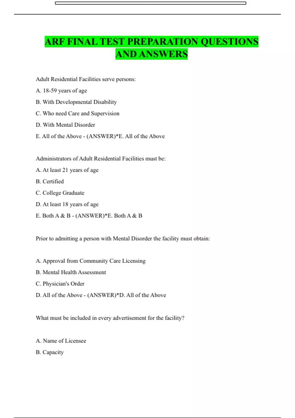 ARF FINAL TEST PREPARATION QUESTIONS