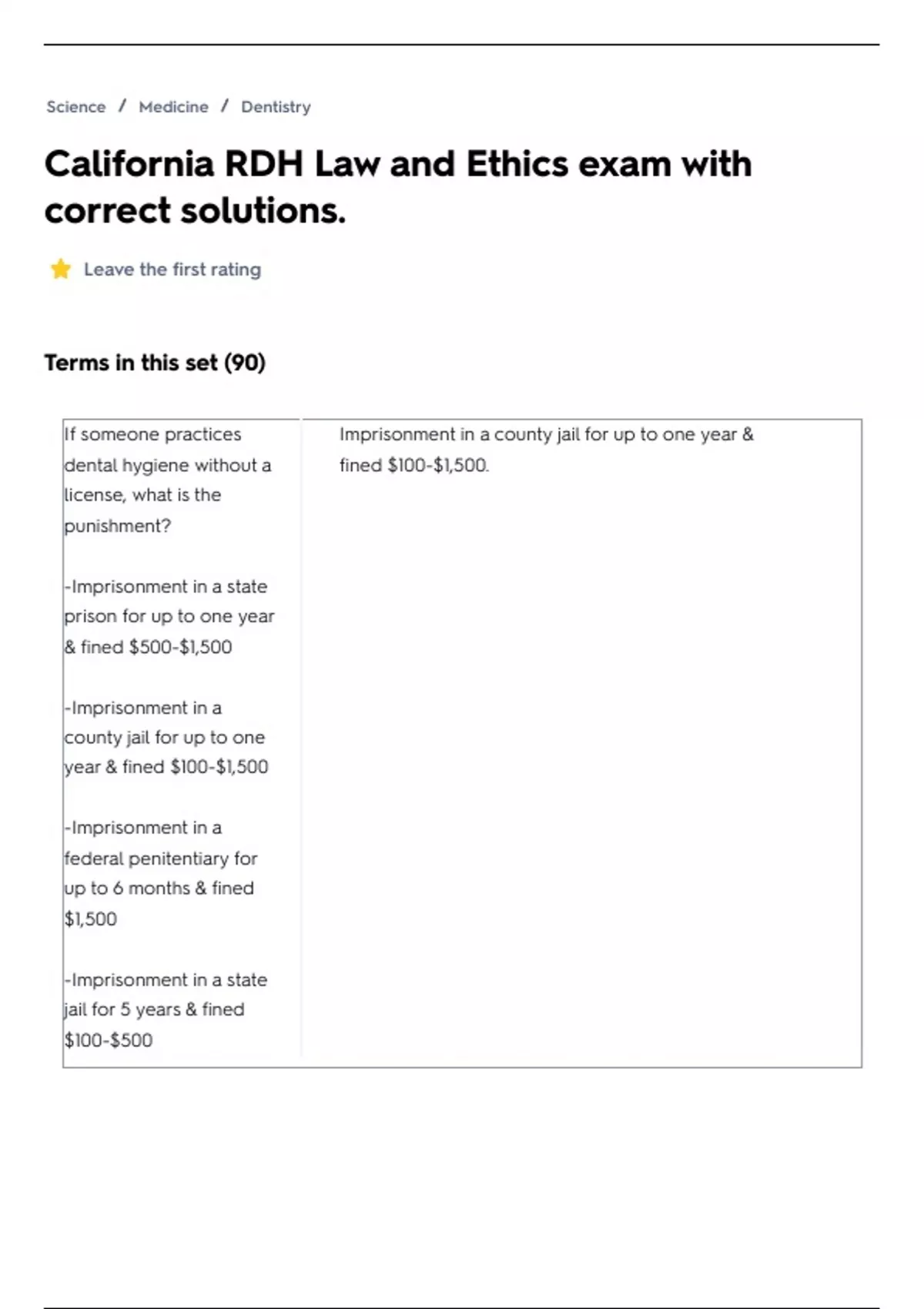 Terms in this set (90) If someone practices dental hygiene without a license, what is the punishment? -Imprisonment in a state prison for up to one year & fined $500-$1,500 -Imprisonment in a county jail for up to one year & fined $100-$1,500 -Imprisonment in a federal penitentiary for up to 6 months & fined $1,500 -Imprisonment in a state jail for 5 years & fined $100-$500 Imprisonment in a county jail for up to one year & fined $100-$1,500. A person who is found guilty of unprofessional conduct is guilty of a _____________ and shall be fined _______________ or imprisoned for ____________ days and/or fined and imprisoned. -misdemeanor; $500-$100; 90-180 -felony; $100-$600; 60- 180 -felony; $500-$1000; 90- 180 -misdemeanor; $100-$600; 60-180 misdemeanor; $100-$600; 60-180 Unprofessional conduct includes all of the following EXCEPT one. Which one is the EXCEPTION? -Aid or abet a licens