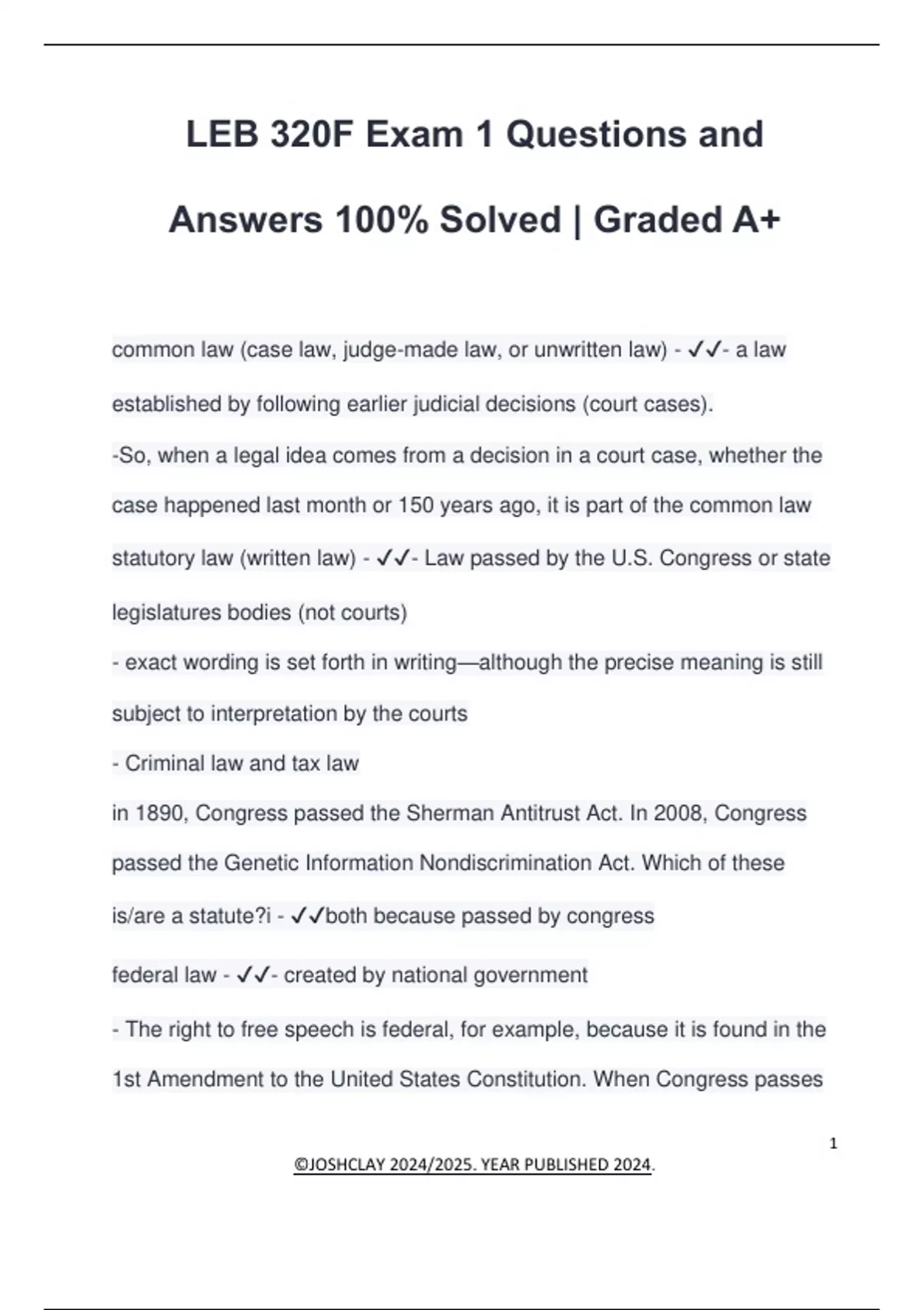 LEB 320F Exam 1 Questions and Answers 100% Solved | Graded A+ common law (case law, judge-made law, or unwritten law) - - a law established by following earlier judicial decisions (court cases). -So, when a legal idea comes from a decision in a court case, whether the case happened last month or 150 years ago, it is part of the common law statutory law (written law) - - Law passed by the U.S. Congress or state legislatures bodies (not courts) - exact wording is set forth in writing—although the precise meaning is still subject to interpretation by the courts - Criminal law and tax law in 1890, Congress passed the Sherman Antitrust Act. In 2008, Congress passed the Genetic Information Nondiscrimination Act. Which of these is/are a statute?i - both because passed by congress federal law - - created by national government - The right to free speech is federal, for example, because it is found in the 1st Amendment to the United States Constitution. When Congress passes