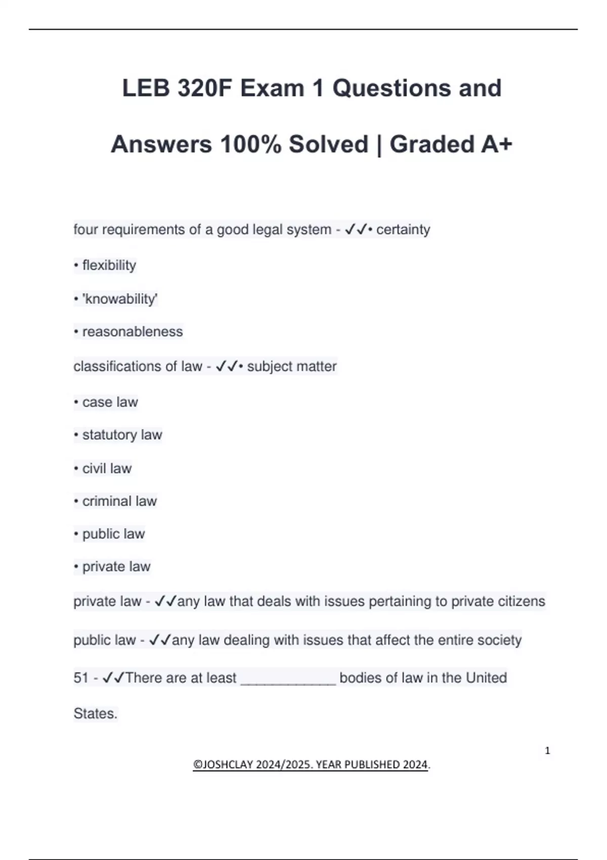 LEB 320F Exam 1 Questions and Answers 100% Solved | Graded A+ four requirements of a good legal system - • certainty • flexibility • 'knowability' • reasonableness classifications of law - • subject matter • case law • statutory law • civil law • criminal law • public law • private law private law - any law that deals with issues pertaining to private citizens public law - any law dealing with issues that affect the entire society 51 - There are at least ____________ bodies of law in the United States.