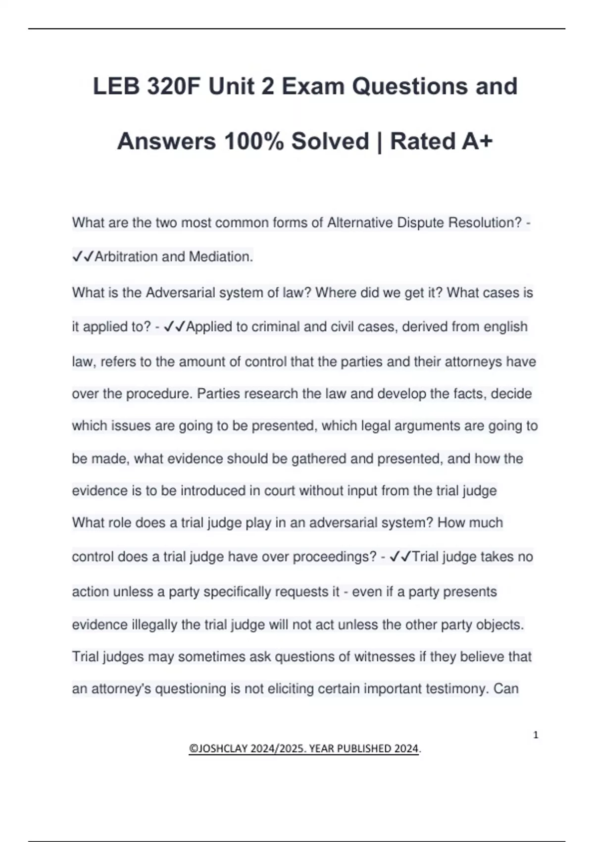 LEB 320F Unit 2 Exam Questions and Answers 100% Solved | Rated A+ What are the two most common forms of Alternative Dispute Resolution? - Arbitration and Mediation. What is the Adversarial system of law? Where did we get it? What cases is it applied to? - Applied to criminal and civil cases, derived from english law, refers to the amount of control that the parties and their attorneys have over the procedure. Parties research the law and develop the facts, decide which issues are going to be presented, which legal arguments are going to be made, what evidence should be gathered and presented, and how the evidence is to be introduced in court without input from the trial judge What role does a trial judge play in an adversarial system? How much control does a trial judge have over proceedings? - Trial judge takes no action unless a party specifically requests it - even if a party presents evidence illegally the trial judge will not act unless the other party objects. Trial judges may sometimes ask questions of witnesses if they believe that an attorney's questioning is not eliciting certain important testimony. Can
