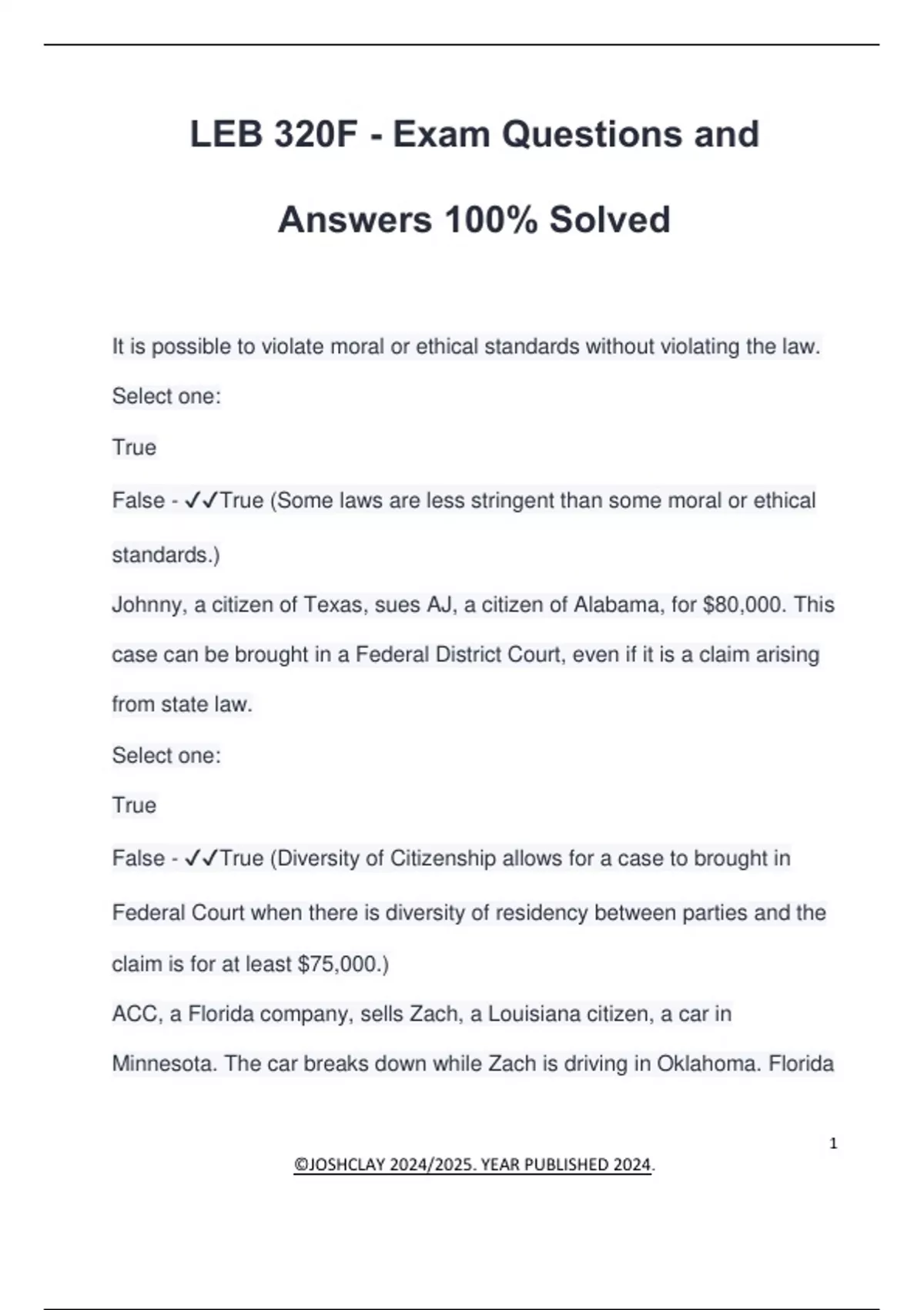 LEB 320F - Exam Questions and Answers 100% Solved It is possible to violate moral or ethical standards without violating the law. Select one: True False - True (Some laws are less stringent than some moral or ethical standards.) Johnny, a citizen of Texas, sues AJ, a citizen of Alabama, for $80,000. This case can be brought in a Federal District Court, even if it is a claim arising from state law. Select one: True False - True (Diversity of Citizenship allows for a case to brought in Federal Court when there is diversity of residency between parties and the claim is for at least $75,000.) ACC, a Florida company, sells Zach, a Louisiana citizen, a car in Minnesota. The car breaks down while Zach is driving in Oklahoma. Florida