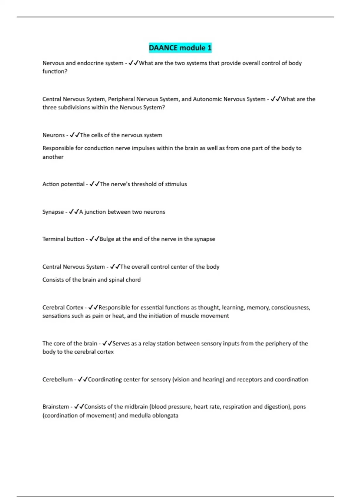 DAANCE module 1 Nervous and endocrine system - What are the two systems that provide overall control of body function? Central Nervous System, Peripheral Nervous System, and Autonomic Nervous System - What are the three subdivisions within the Nervous System?