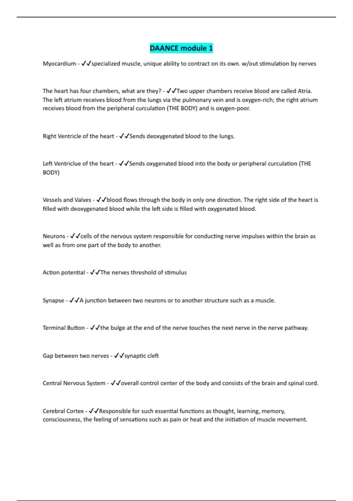 DAANCE module 1 Myocardium - specialized muscle, unique ability to contract on its own. w/out stimulation by nerves The heart has four chambers, what are they? - Two upper chambers receive blood are called Atria. The left atrium receives blood from the lungs via the pulmonary vein and is oxygen-rich; the right atrium receives blood from the peripheral curculation (THE BODY) and is oxygen-poor.