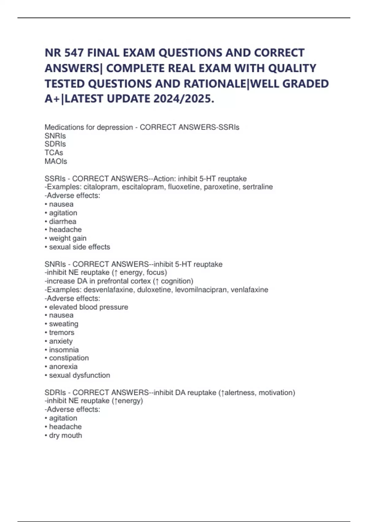 NR 547 FINAL EXAM QUESTIONS AND CORRECT ANSWERS| COMPLETE REAL EXAM WITH QUALITY TESTED QUESTIONS AND RATIONALE|WELL GRADED A+|LATEST UPDATE 2024/2025. Medications for depression - CORRECT ANSWERS-SSRIs SNRIs SDRIs TCAs MAOIs SSRIs - CORRECT ANSWERS--Action: inhibit 5-HT reuptake -Examples: citalopram, escitalopram, fluoxetine, paroxetine, sertraline -Adverse effects: • nausea • agitation • diarrhea • headache • weight gain • sexual side effects SNRIs - CORRECT ANSWERS--inhibit 5-HT reuptake -inhibit NE reuptake (↑ energy, focus) -increase DA in prefrontal cortex (↑ cognition) -Examples: desvenlafaxine, duloxetine, levomilnacipran, venlafaxine -Adverse effects: • elevated blood pressure • nausea • sweating • tremors • anxiety • insomnia • constipation • anorexia • sexual dysfunction SDRIs - CORRECT ANSWERS--inhibit DA reuptake (↑alertness, motivation) -inhibit NE reuptake (↑energy) -Adverse effects: • agitation • headache • dry mouth