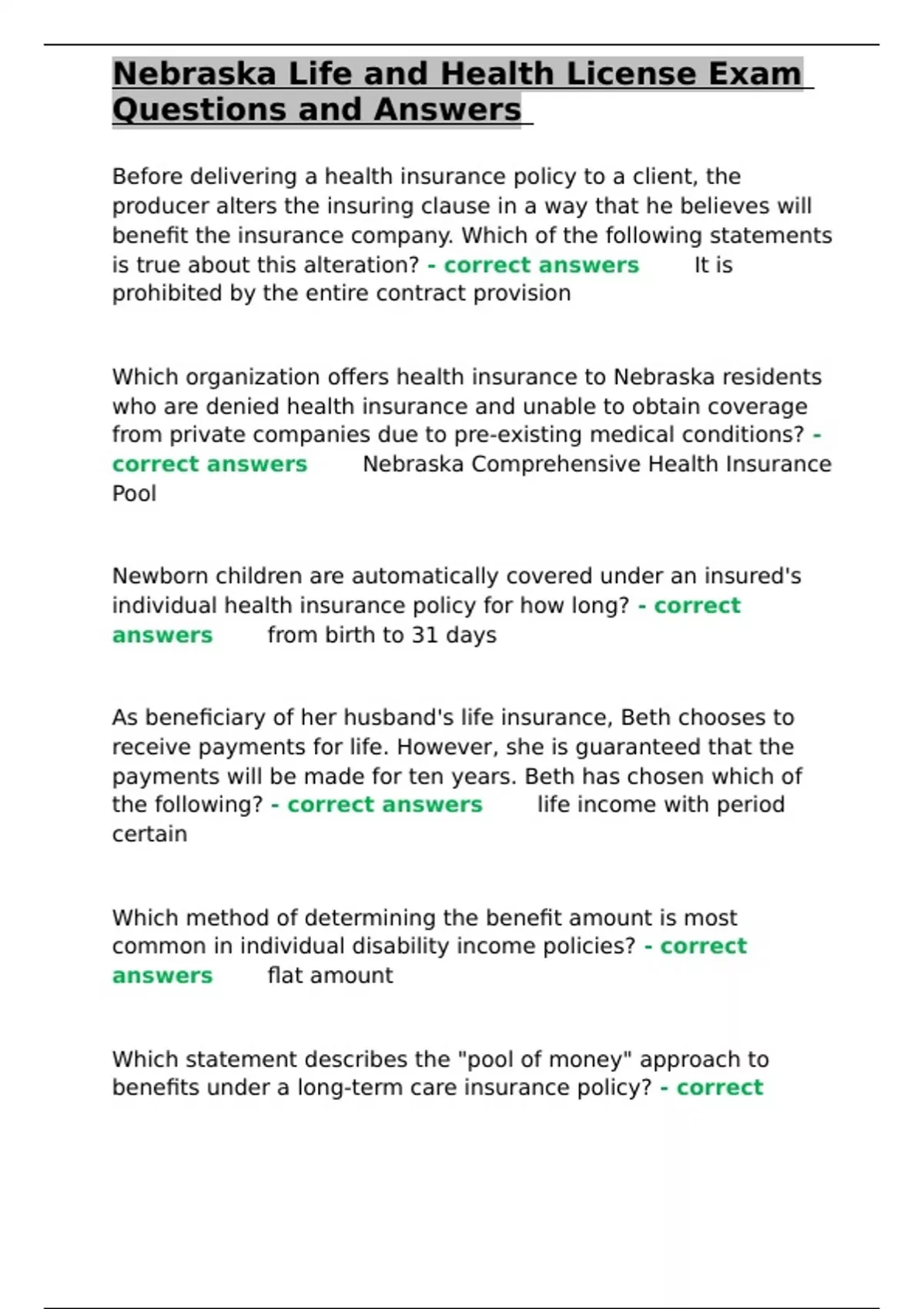 Nebraska Life and Health License Exam Questions and Answers