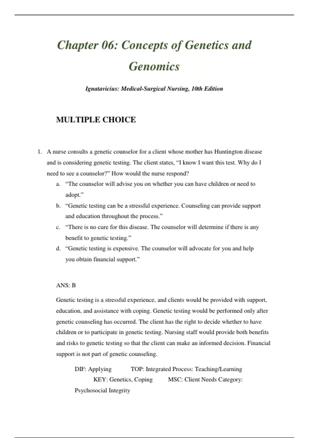 MULTIPLE CHOICE 1. A nurse consults a genetic counselor for a client whose mother has Huntington disease and is considering genetic testing. The client states, “I know I want this test. Why do I need to see a counselor?” How would the nurse respond? a. “The counselor will advise you on whether you can have children or need to adopt.” b. “Genetic testing can be a stressful experience. Counseling can provide support and education throughout the process.” c. “There is no cure for this disease. The counselor will determine if there is any benefit to genetic testing.” d. “Genetic testing is expensive. The counselor will advocate for you and help you obtain financial support.” ANS: B Genetic testing is a stressful experience, and clients would be provided with support, education, and assistance with coping. Genetic testing would be performed only after genetic counseling has occurred. The client has the right to decide whether to have children or to participate in genetic testing. Nursing staff would provide both benefits and risks to genetic testing so that the client can make an informed decision. Financial support is not part of genetic counseling. DIF: Applying TOP: Integrated Process: Teaching/Learning KEY: Genetics, Coping MSC: Client Needs Category: Psychosocial Integrity 2. A primary health care provider prescribes genetic testing for a client who has a family history of colorectal cancer. Which action would the nurse take before scheduling the client for the procedure? a. Confirm that informed consent was obtained and placed on the patient’s chart. b. Provide genetic counseling to the client and the patient’s family members. c. Assess if the client is prepared for the risk of psychological side effects. d. Respect the patient’s right not to share the results of the genetic test. ANS: A Informed consent is required before genetic testing. The person tested is the one who gives consent. An advanced practice provider would explain the procedure and provide genetic counseling. Although the client would be prepared for the risk of psychological side effects and the patient’s rights would be respected, the procedure cannot occur without informed consent. DIF: Applying TOP: Integrated Process: Communication and Documentation KEY: Genetics, Informed consent MSC: Client Needs Category: Safe and Effective Care Environment: Management of Care 3. A nurse cares for an adult client who has received genetic testing. The patient’s mother asks to receive the results of the genetic tests. Which action would the nurse take? a. Obtain a signed consent from the client allowing test results to be released to the mother. b. Invite the mother and other family members to participate in genetic counseling with the client. c. Encourage the mother to undergo genetic testing to determine if she has the same risks as her child. d. Direct the mother to speak with the client and support the client’s decision to share or not share the results.