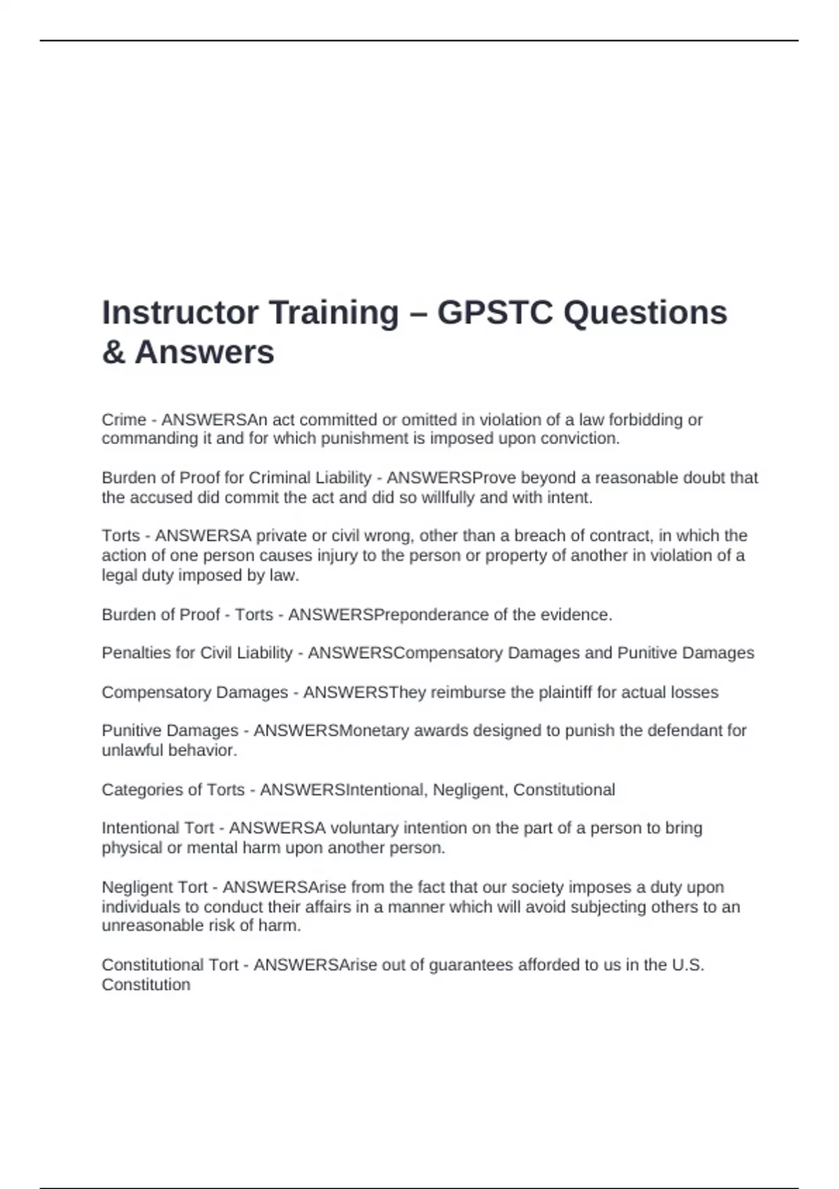 Crime - ANSWERSAn act committed or omitted in violation of a law forbidding or commanding it and for which punishment is imposed upon conviction. Burden of Proof for Criminal Liability - ANSWERSProve beyond a reasonable doubt that the accused did commit the act and did so willfully and with intent. Torts - ANSWERSA private or civil wrong, other than a breach of contract, in which the action of one person causes injury to the person or property of another in violation of a legal duty imposed by law. Burden of Proof - Torts - ANSWERSPreponderance of the evidence. Penalties for Civil Liability - ANSWERSCompensatory Damages and Punitive Damages Compensatory Damages - ANSWERSThey reimburse the plaintiff for actual losses Punitive Damages - ANSWERSMonetary awards designed to punish the defendant for unlawful behavior. Categories of Torts - ANSWERSIntentional, Negligent, Constitutional Intentional Tort - ANSWERSA voluntary intention on the part of a person to bring physical or mental harm upon another person. Negligent Tort - ANSWERSArise from the fact that our society imposes a duty upon individuals to conduct their affairs in a manner which will avoid subjecting others to an unreasonable risk of harm. Constitutional Tort - ANSWERSArise out of guarantees afforded to us in the U.S. Constitution Title 42, U.S. Code, Section 1983 - ANSWERSLaw enforcement can be liable for depriving someone or their civil rights. - Acting under color of law - Alleged deprivation of rights secured by the constitution and laws - Liable only for intentional torts or acts of gross negligence; evil motive or intent or reckless or callous indifference Simple Negligence - ANSWERSFailure to use that degree of care that an ordinary prudent person would use in like circumstances Gross Negligence - ANSWERSFailure to perform a manifest duty in reckless disregard of the consequences as affecting the life or property of another Willful Negligence - ANSWERSIntentional act of unreasonable character in disregard of a known risk so obvious that the actor must have been aware of it and so great as to make it highly probable that harm would follow Requirements to Prevail in a Tort Action - ANSWERS1.) A legal duty requiring one to conduct him/her self-according to a certain standard must exist 2.) A failure to conform (deviate) conduct to this standard must exist 3.) Direct (proximate) cause which is a sufficiently close link between the act of negligence and the harm suffered by another must exist 4.) Damage results must be suffered by another. ***Almost all training liability is based on negligence law*** Negligent Training - ANSWERSFailure to train at all, which courts presume to be gross negligence, or training which is conducted improperly. Training which does exist may be either poorly designed or poorly executed Negligent Supervision - ANSWERSFailure on your part to coordinate, control or direct trainee conduct which may cause an injury Negligent Entrustment - ANSWERSFailure to control dangerous equipment or devices which are entrusted to trainees Negligent Retention - ANSWERSFailure on your part to take action when you have (or should have) determined a trainee is unsuitable to continue, or the magnitude of that trainee's acts demonstrate they are a foreseeable danger Causes of Action for Which Instructors May Be Found Liable - ANSWERS1.) Negligent Training 2.) Negligent Entrustment 3.) Negligent Supervision 4.) Negligent Retention Equal Employment Opportunity Commission (EEOC) - ANSWERSMakes it unlawful for an employer to discriminate based on race, color, religion, sex or national origin Disparate Treatment - ANSWERSInvolves the kind of treatment a trainee receives from trainers which may differ from the treatment given to other trainees and the only basis for the different treatment is the person's race, color, religion, sex or national origin Disparate Impact - ANSWERSInvolves the use of training practices which on the surface appear facially neutral in their treatment of different groups, but will impact more severely one protected class and cannot be justified by business necessity Reducing Classroom Liability - ANSWERS1.) Written Procedures 2.) Provide these Written Procedures to All Students 3.) Always Follow an Approved Lesson Plan 4.) Teach and Follow Safe Practices in All Class Activities 5.) Ensure Class Sizes are Reasonable and Instructor/Student Ratios are not Exceeded 6.) Supervision 7.) All Machinery and Equipment Should be Tested on a Regular Basis 8.) Specific Procedures 9.) Activity Areas 10.) Safety Devices 11.) Remove Broken Equipment or Machinery 12.) Ensure Trainers are Qualified 13.) Ensure Records are Accurate 14.) Keep Course Materials Up-To-Date Bloom's Taxonomy - ANSWERSHeirachy of steps that must be taken in order to master a process. Taxonomy - ANSWERSClassification or structure Domain - ANSWERSCategory KAS - ANSWERSKnowledge Attitude Skills Cognitive (Knowledge) - ANSWERSInvolves the development of intellectual skills. Six Categories of the Cognitive Process - ANSWERS1.) Knowledge 2.) Comprehension 3.) Application 4.) Analysis 5.) Synthesis 6.) Evaluation Affective (Attitude) - ANSWERSRefers to how people deal with things emotionally, such as feelings, motivation, and enthusiasm Five Categories of the Affective Process - ANSWERS1.) Receiving 2.) Responding 3.) Valuing 4.) Organization 5.) Characterization Psychomotor (Skills) - ANSWERSRefers to physical movement, coordination and use of motor skills to accomplish a task Five Categories of Psychomotor Process - ANSWERSImitation Manipulation Precision Articulation Naturalization VARK - ANSWERSVisual Learners Aurual/Auditory Learners Reading/Writing Kinesthetic Visual Learners - ANSWERSPrefer the use of images to understand information. Aural/Auditory Learners - ANSWERSPrefer listening and speaking in situations such as lectures and group discussions. Reading/Writing - ANSWERSStudents with strong reading and writing preferences learn best through wo