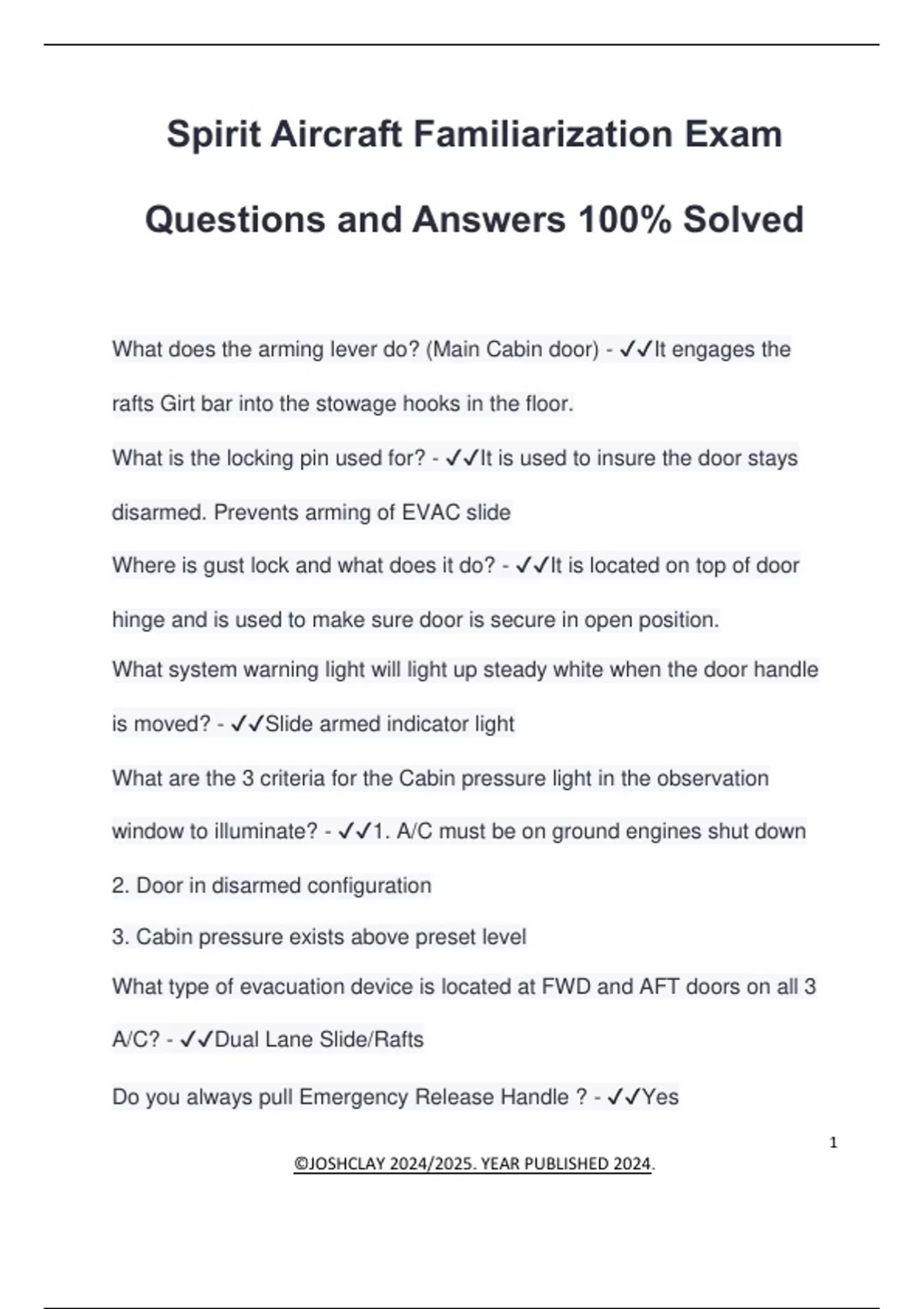 Spirit Aircraft Familiarization Exam Questions and Answers 100% Solved What does the arming lever do? (Main Cabin door) - It engages the rafts Girt bar into the stowage hooks in the floor. What is the locking pin used for? - It is used to insure the door stays disarmed. Prevents arming of EVAC slide Where is gust lock and what does it do? - It is located on top of door hinge and is used to make sure door is secure in open position. What system warning light will light up steady white when the door handle is moved? - Slide armed indicator light What are the 3 criteria for the Cabin pressure light in the observation window to illuminate? - 1. A/C must be on ground engines shut down 2. Door in disarmed configuration 3. Cabin pressure exists above preset level What type of evacuation device is located at FWD and AFT doors on all 3 A/C? - Dual Lane Slide/Rafts Do you always pull Emergency Release Handle ? - Yes