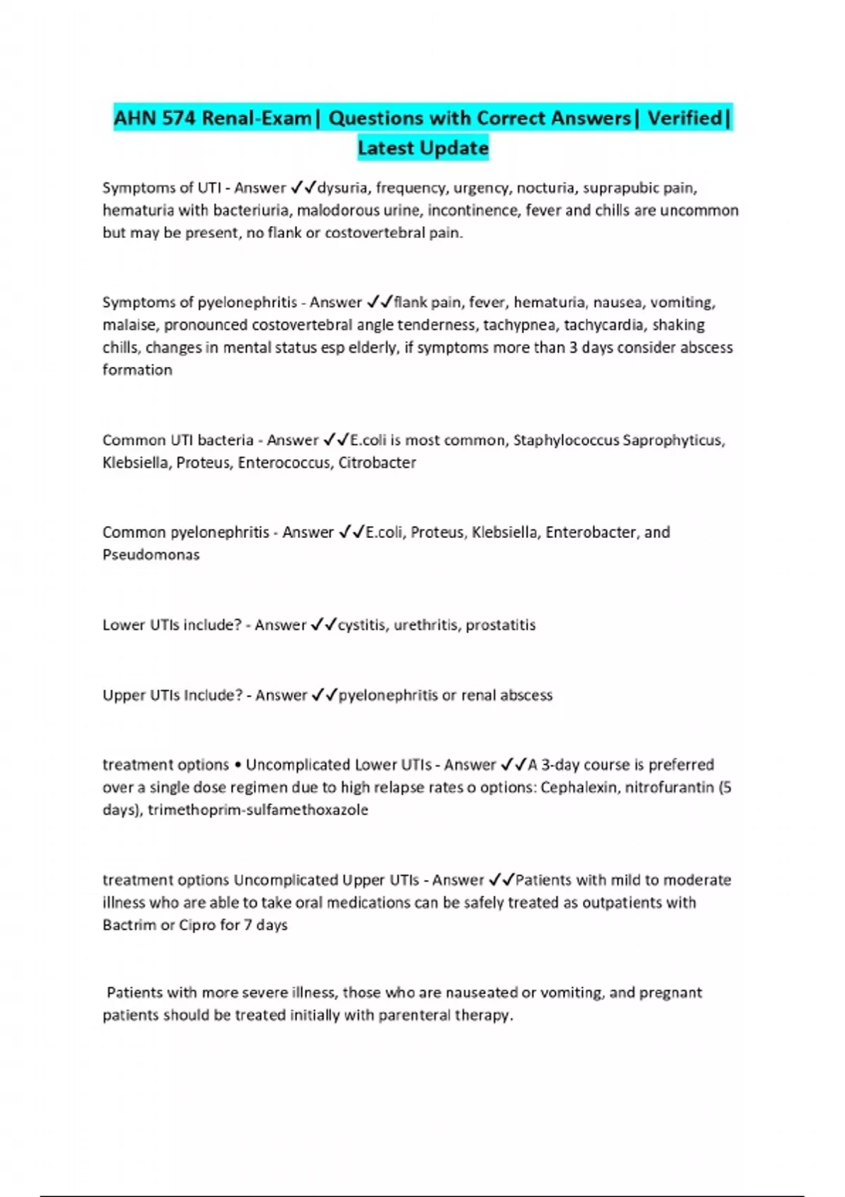 AHN 574 Renal-Exam| Questions with Correct Answers| Verified| Latest Update