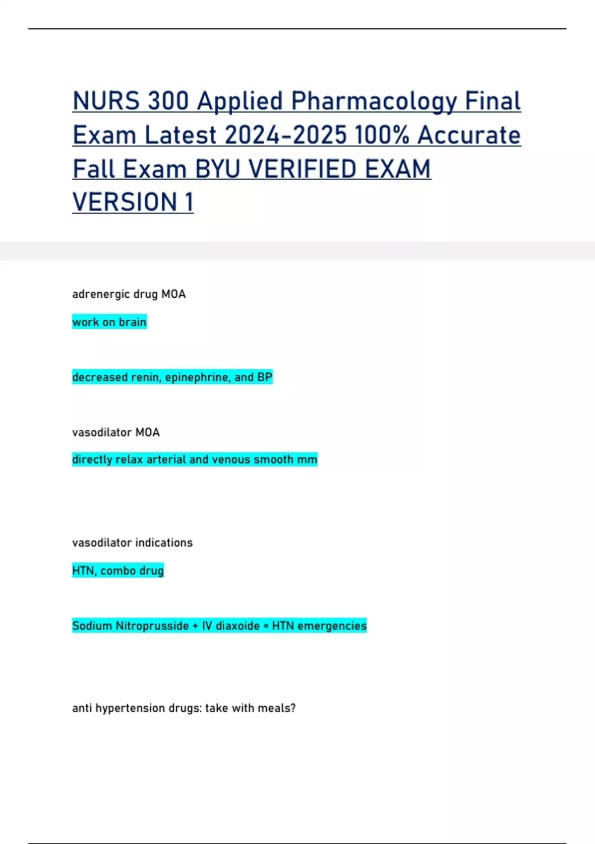 NURS 300 Applied Pharmacology Final Exam Latest % Accurate Fall Exam BYU VERIFIED EXAM VERSION 1
