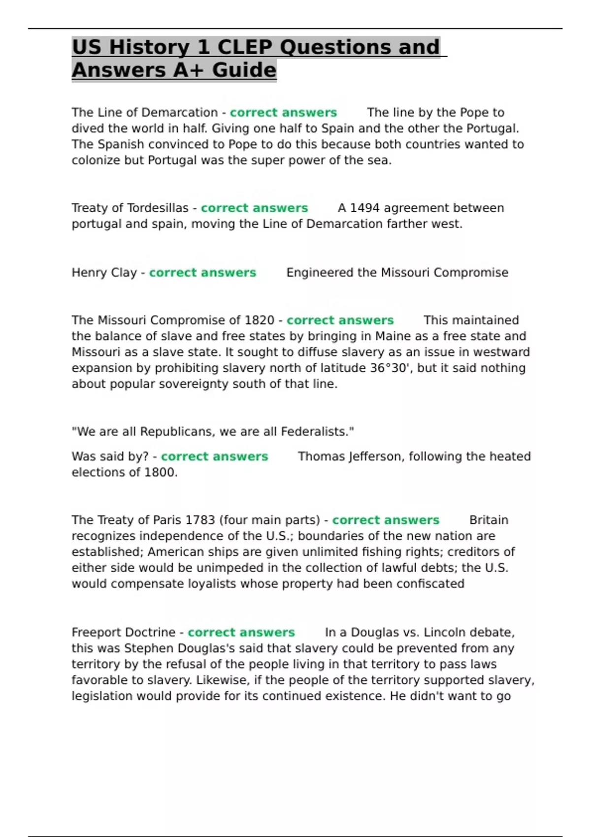 US History 1 CLEP Questions and Answers A+ Guide