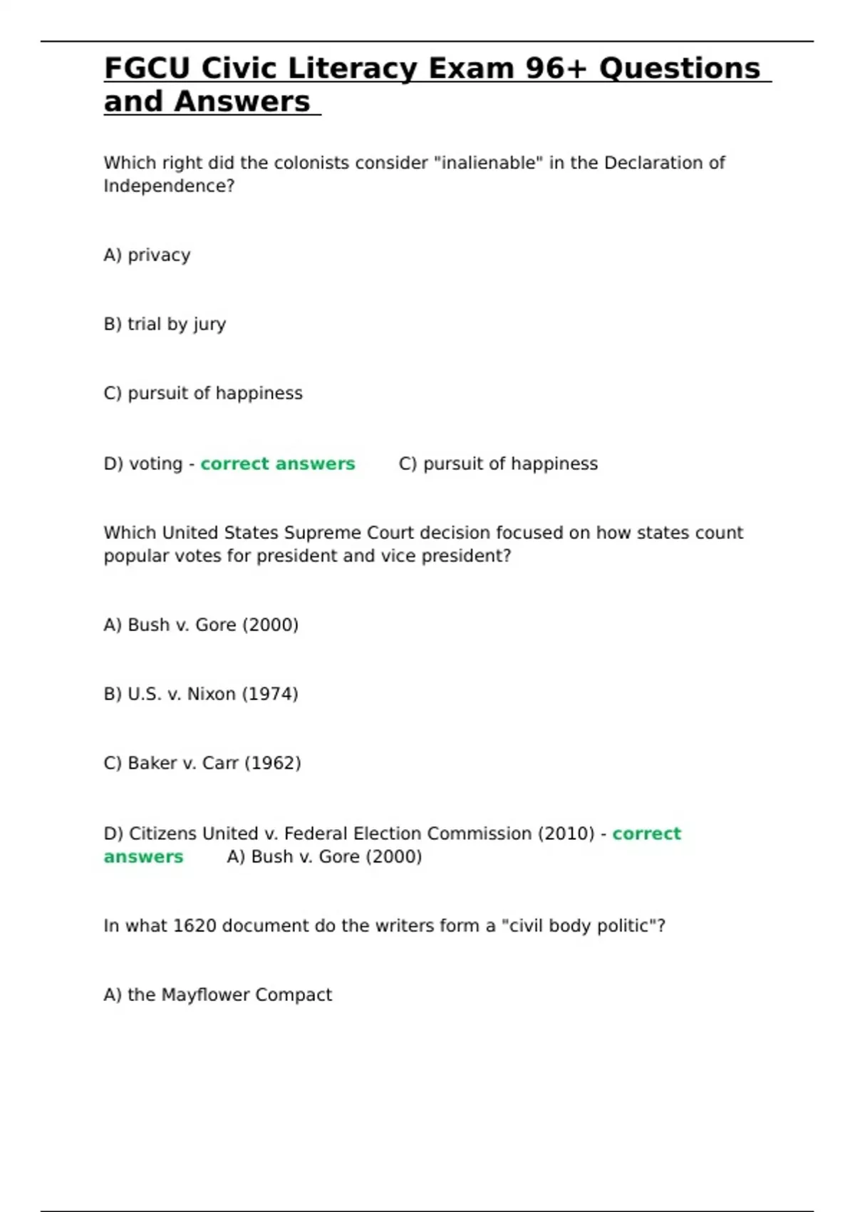 FGCU Civic Literacy Exam 96+ Questions and Answers
