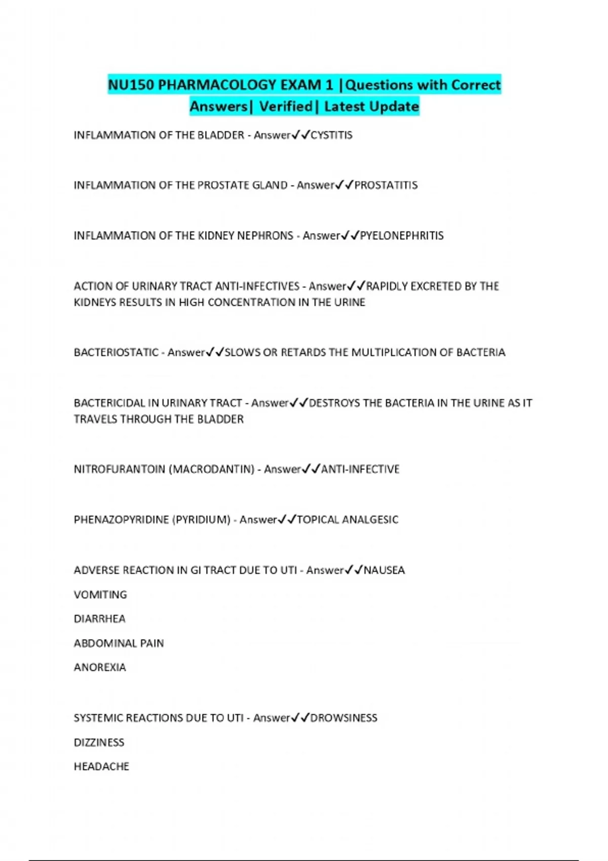 NU150 PHARMACOLOGY EXAM 1 |Questions with Correct Answers| Verified| Latest Update