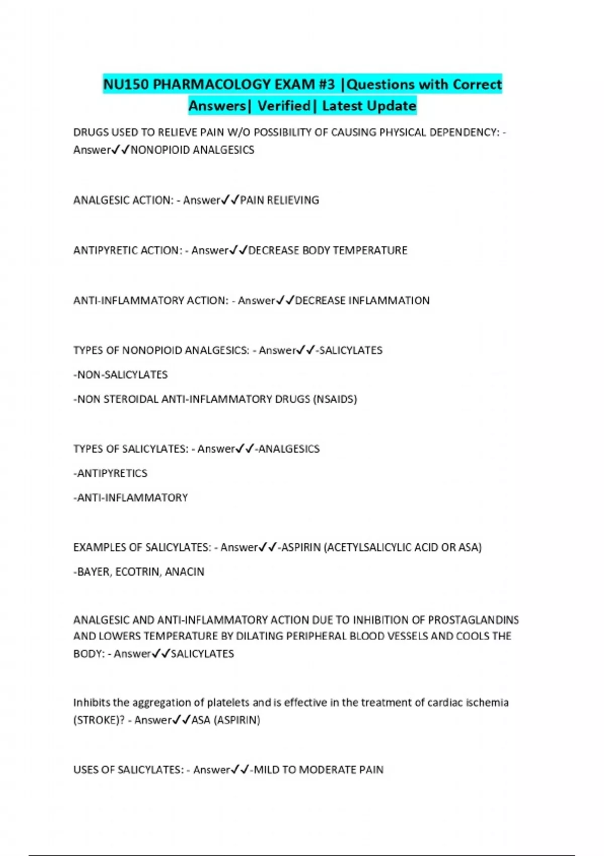 NU150 PHARMACOLOGY EXAM #3 |Questions with Correct Answers| Verified| Latest Update