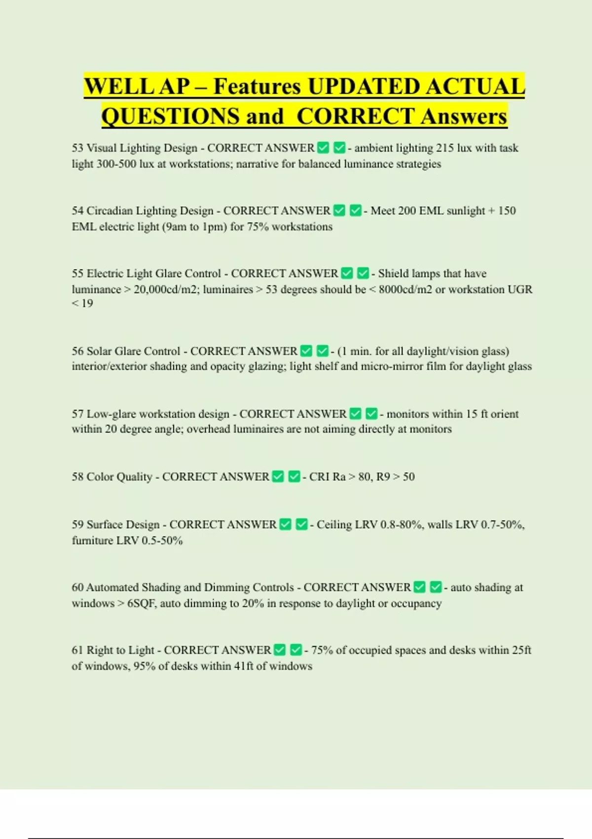 61 Right to Light - CORRECT ANSWER - 75% of occupied spaces and desks within 25ft