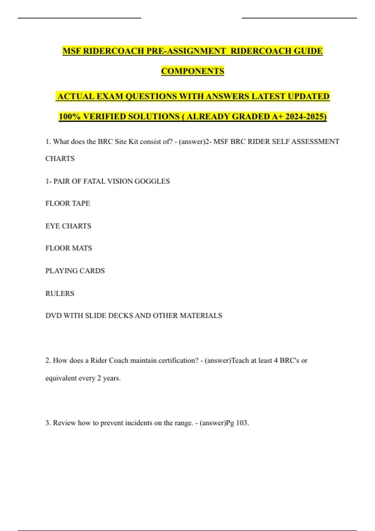 MSF RIDERCOACH PRE-ASSIGNMENT RIDERCOACH GUIDE COMPONENTS ACTUAL EXAM QUESTIONS WITH ANSWERS LATEST UPDATED 100% VERIFIED SOLUTIONS ( ALREADY GRADED A+ )