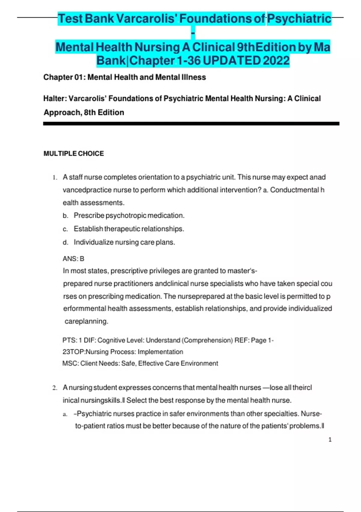 , Test Bank Varcarolis' Foundations of Psychiatric-