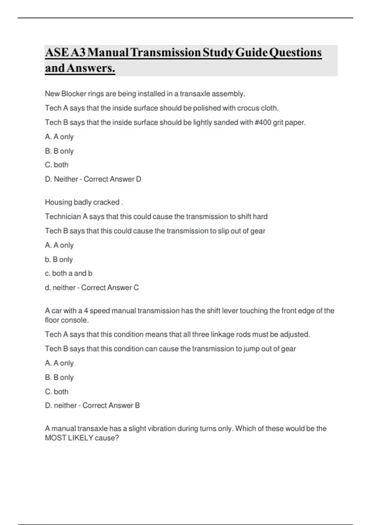 ASEA3ManualTransmissionStudyGuideQuestions andAnswers. New Blocker rings are being installed in a transaxle assembly. Tech A says that the inside surface should be polished with crocus cloth. Tech B says that the inside surface should be lightly sanded with #400 grit paper. A. A only B. B only C. both D. Neither - Correct Answer D Housing badly cracked . Technician A says that this could cause the transmission to shift hard Tech B says that this could cause the transmission to slip out of gear A. A only b. B only c. both a and b d. neither - Correct Answer