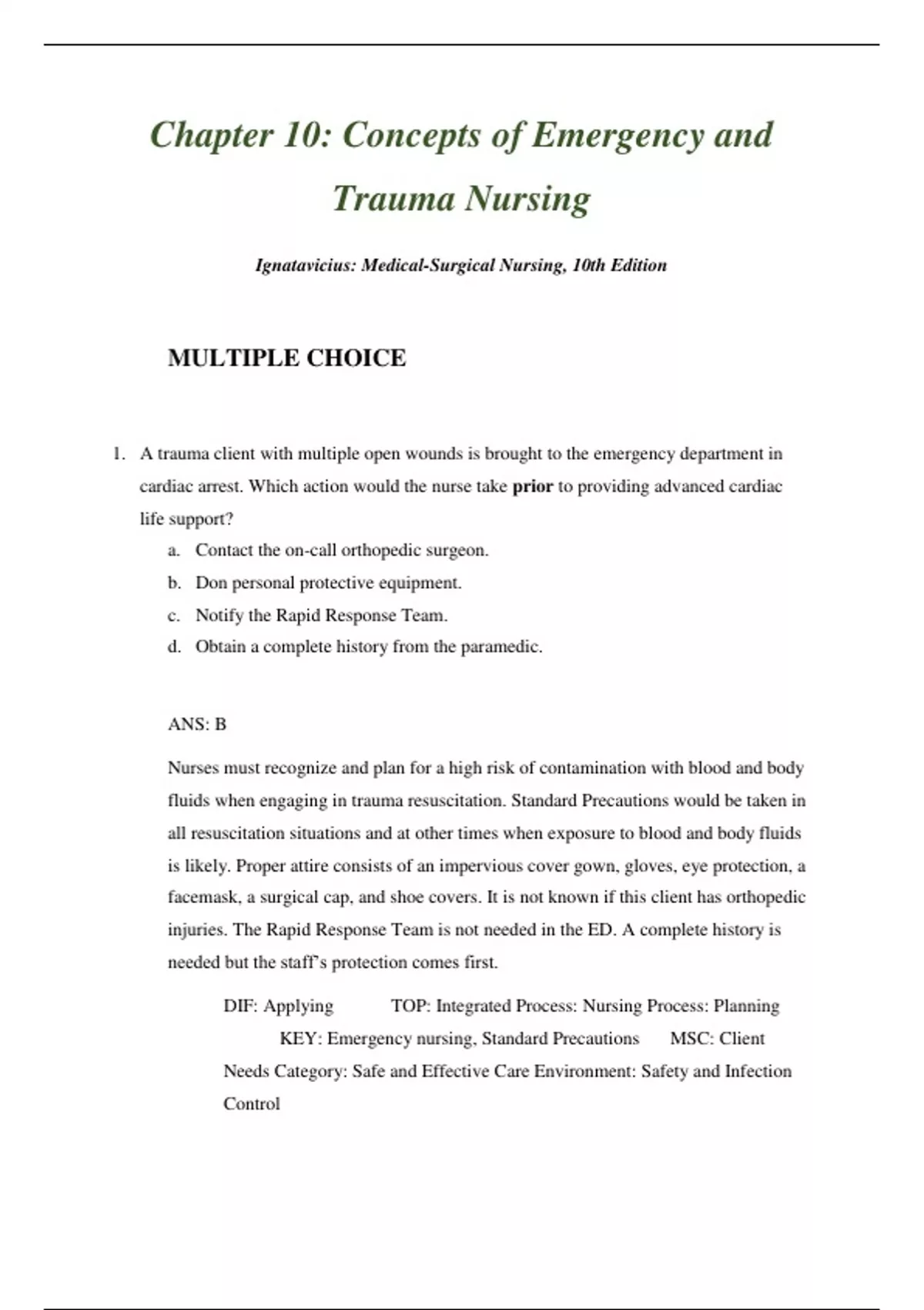 KEY: Emergency nursing, Standard Precautions MSC: Client