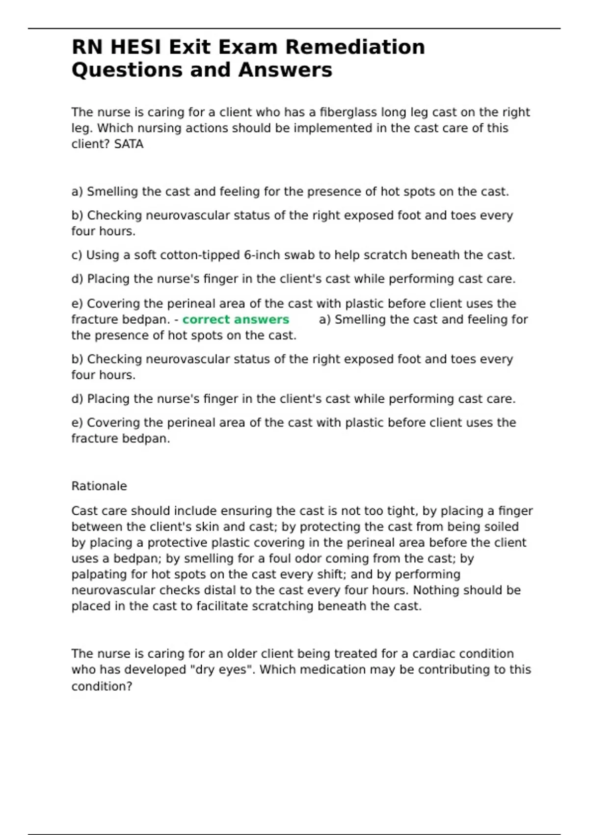 fracture bedpan. - correct answers✅✅a) Smelling the cast and feeling for