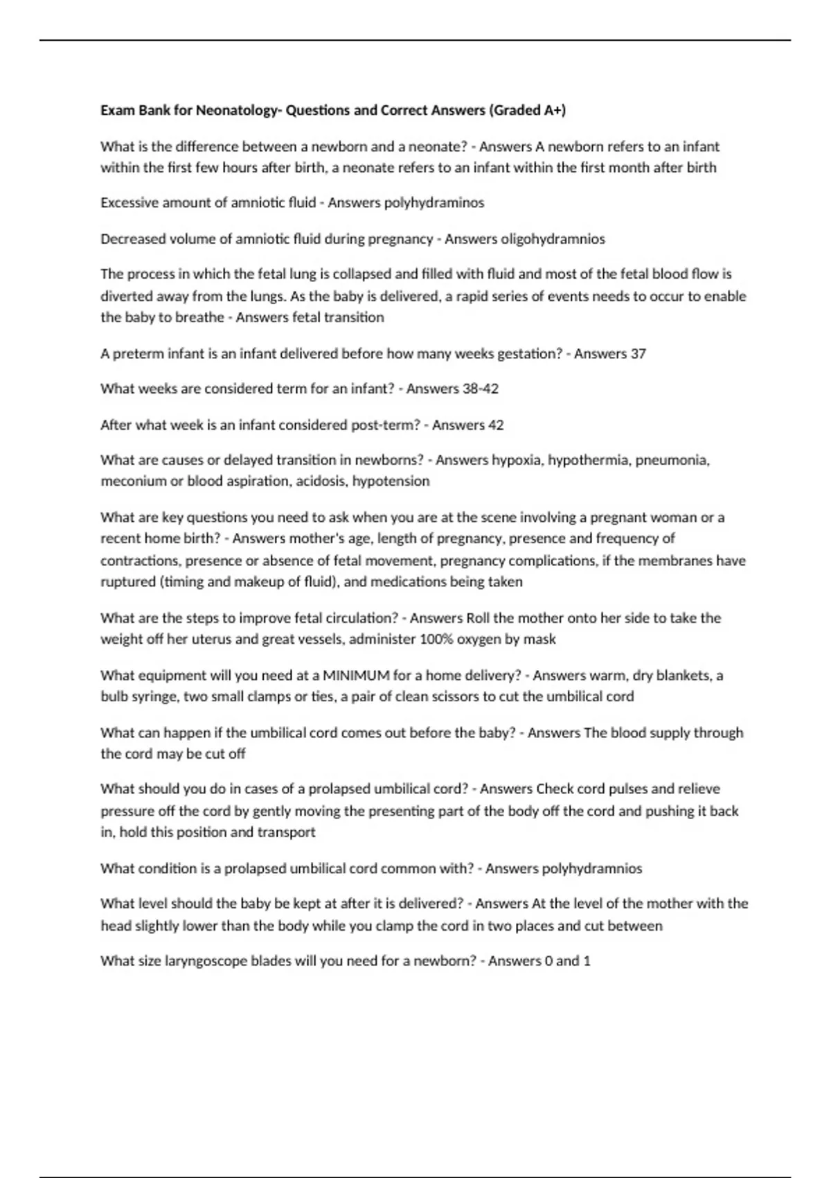 Exam Bank for Neonatology- Questions and Correct Answers (Graded A+) What is the difference between a newborn and a neonate? - Answers A newborn refers to an infant within the first few hours after birth, a neonate refers to an infant within the first month after birth Excessive amount of amniotic fluid - Answers polyhydraminos Decreased volume of amniotic fluid during pregnancy - Answers oligohydramnios The process in which the fetal lung is collapsed and filled with fluid and most of the fetal blood flow is diverted away from the lungs. As the baby is delivered, a rapid series of events needs to occur to enable the baby to breathe - Answers fetal transition A preterm infant is an infant delivered before how many weeks gestation? - Answers 37 What weeks are considered term for an infant? - Answers 38-42 After what week is an infant considered post-term? - Answers 42 What are causes or delayed transition in newborns? - Answers hypoxia, hypothermia, pneumonia, meconium or blood aspiration, acidosis, hypotension What are key questions you need to ask when you are at the scene involving a pregnant woman or a recent home birth? - Answers mother's age, length of pregnancy, presence and frequency of contractions, presence or absence of fetal movement, pregnancy complications, if the membranes have ruptured (timing and makeup of fluid), and medications being taken What are the steps to improve fetal circulation? - Answers Roll the mother onto her side to take the weight off her uterus and great vessels, administer 100% oxygen by mask What equipment will you need at a MINIMUM for a home delivery? - Answers warm, dry blankets, a bulb syringe, two small clamps or ties, a pair of clean scissors to cut the umbilical cord What can happen if the umbilical cord comes out before the baby? - Answers The blood supply through the cord may be cut off What should you do in cases of a prolapsed umbilical cord? - Answers Check cord pulses and relieve pressure off the cord by gently moving the presenting part of the body off the cord and pushing it back in, hold this position and transport What condition is a prolapsed umbilical cord common with? - Answers polyhydramnios What level should the baby be kept at after it is delivered? - Answers At the level of the mother with the head slightly lower than the body while you clamp the cord in two places and cut between What size laryngoscope blades will you need for a newborn? - Answers 0 and 1 A decrease in the amount of oxygen delivered to the extremities. The hands and feet turn blue because of narrowing of small arterioles toward the end of the arms and legs - Answers acrocyanosis A clear, slightly yellowish liquid that surrounds the unborn baby during pregnancy; contained in the amniotic sac - Answers amniotic fluid Scale used to assess newborn infant status 1 and 5 minutes after delivery - Answers APGAR score What does APGAR stand for? - Answers appearance, pulse, grimace, activity, respirations A narrowing or blockage of the nasal airway by membranous or bony tissue; a congenital condition - Answers choanal atresia An abnormal defect or fissure in the upper lip that failed to close during development - Answers cleft lip A fissure or hole in the palate that forms a communicating pathway between the mouth and nasal cavities - Answers cleft palate Passage of loops of bowel with or without abdominal organs, through the diaphragm muscle; occurs as the bowel from the abdomen "herniates" upward through the diaphragm into the chest - Answers diaphragmatic hernia Lack of movement at the shoulder due to nerve injury resulting from the stretching of the cervical nerve roots during delivery of the baby's head during birth; the effect is usually transient, but can be permanent - Answers Erb palsy Low or poor muscle tone, "floppy" - Answers hypotonia Damage to cells int he central nervous system from inadequate oxygenation - Answers hypoxic ischemic encephalopathy Skin sucking in between the ribs, seen when a patient creates increased negative intrathoracic pressure to breathe - Answers intercostal retractions An event where one part of the intestine folds onto another part of the intestines, leads to blockage - Answers intussusception An injury of childbirth affecting the spinal nerves C7, C8, and T1 of the brachial plexus. - Answers Klumpke Paralysis A congenital anomaly of rotation of the midgut, the small bowel is found predominantly on the right side of the abdomen - Answers malrotation A dark green fecal material that accumulates int he fetal intestines and is discharged around the time of birth - Answers meconium Delayed transition from fetal to neonatal circulation - Answers persistent pulmonary hypertension A condition present at birth marked by a very small lower jaw. The tongue tends to fall backward and downward and there is a cleft soft palate - Answers Pierre Robin Sequence Abnormal location of the placenta in the lower part of the uterus, near or over the cervix - Answers placenta previa Abnormally high red blood cell count - Answers polycythemia Apnea caused by oxygen deprivation; usually corrected with stimulation such as drying or slapping the newborn's feet - Answers primary apnea First pregnancy - Answers primigravida When the umbilical cord presents itself outside the uterus while the fetus is still inside - Answers prolapsed cord A disease of the eye that affects prematurely newborn babies, thought to be caused by disorganized growth of retinal blood vessels resulting in scarring and retinal detachment; can lead to blindness - Answers retinopathy of prematurity When asphyxia continues after primary apnea, infant responds with a period of gasping respirations, falling pulse rate and BP - Answers secondary apnea A substance formed in the lungs that helps keep small air sacs or alveoli from collapsing and sticking together - Answers surfactant Blood vessel in umbilical cord used to administer emergency medications - Answers umbilical vein What is the prim