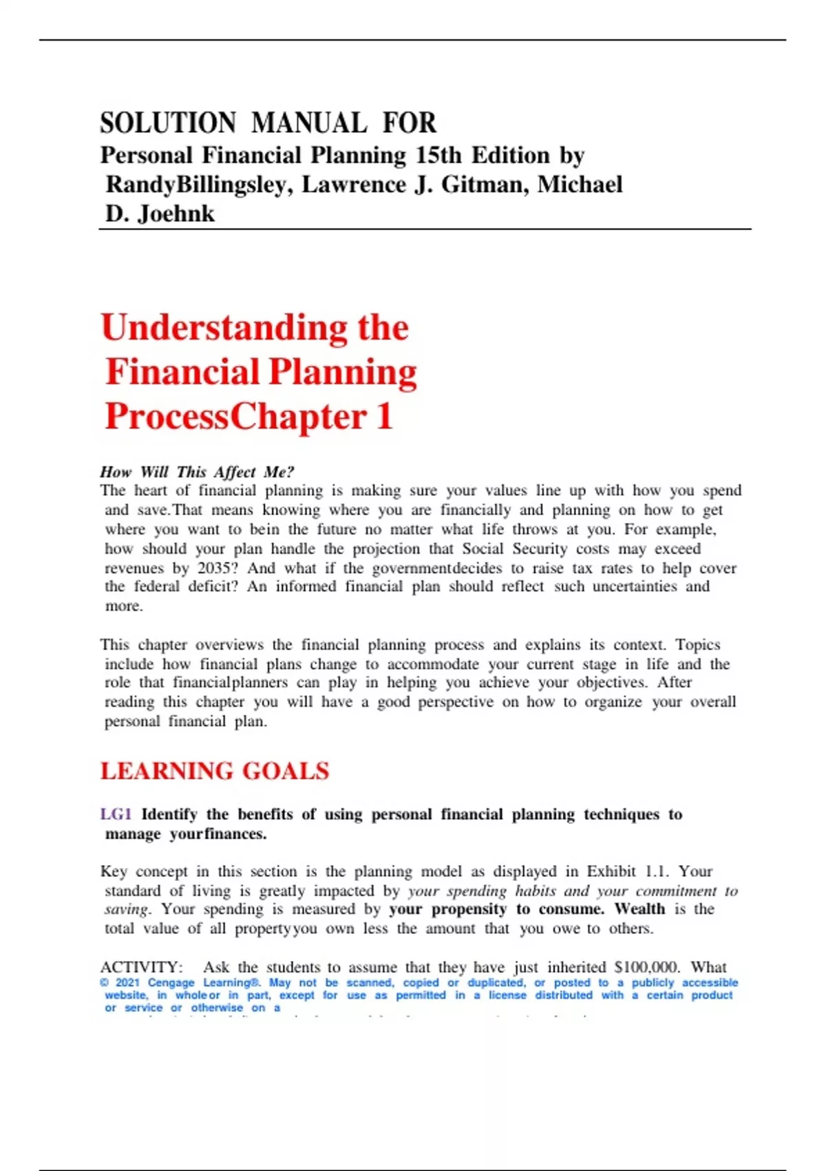 SOLUTION MANUAL FOR Personal Financial Planning 15th Edition by Randy Billingsley, Lawrence J. Gitman, Michael D. Joehnk