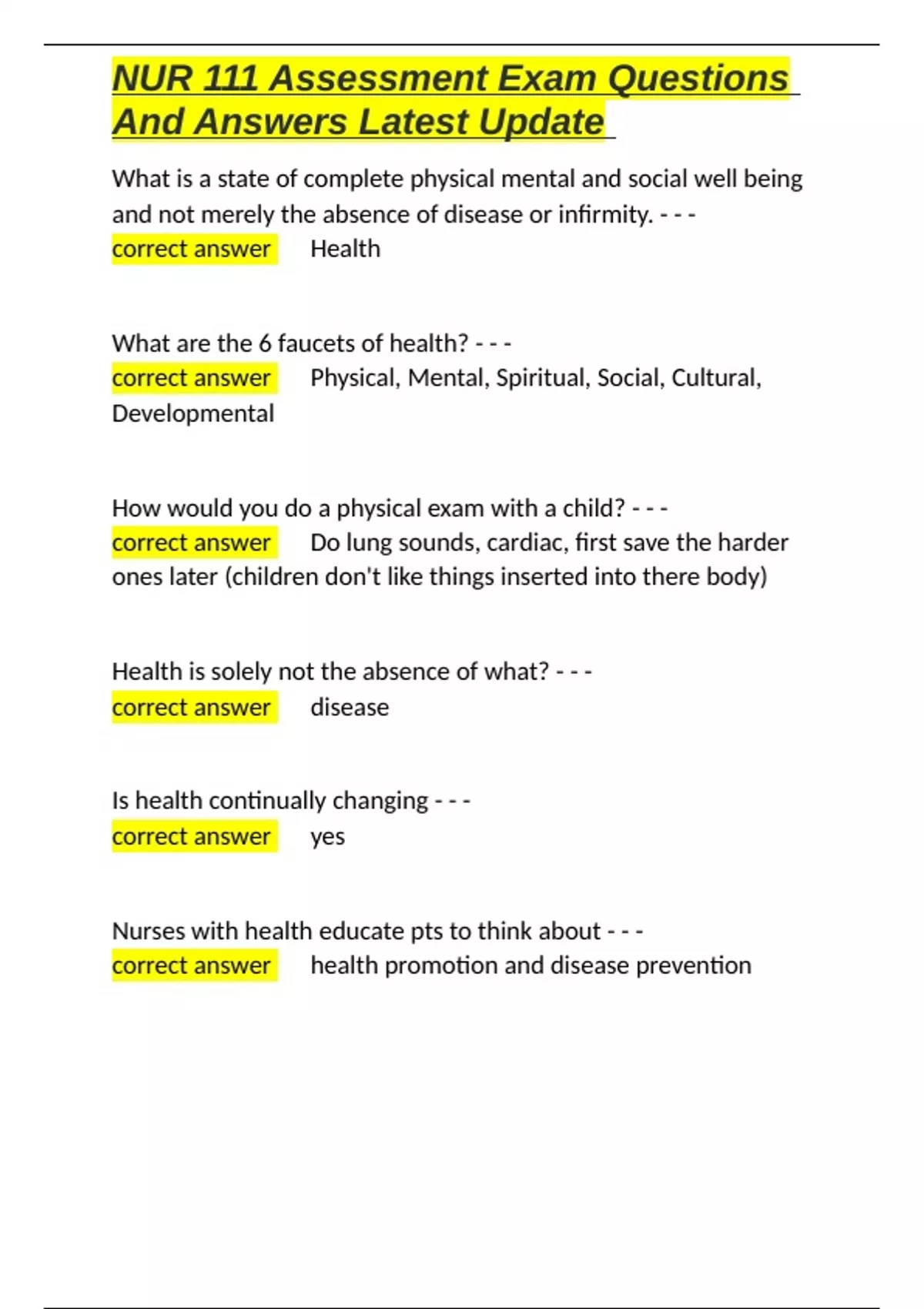 , NUR 111 Assessment Exam Questions