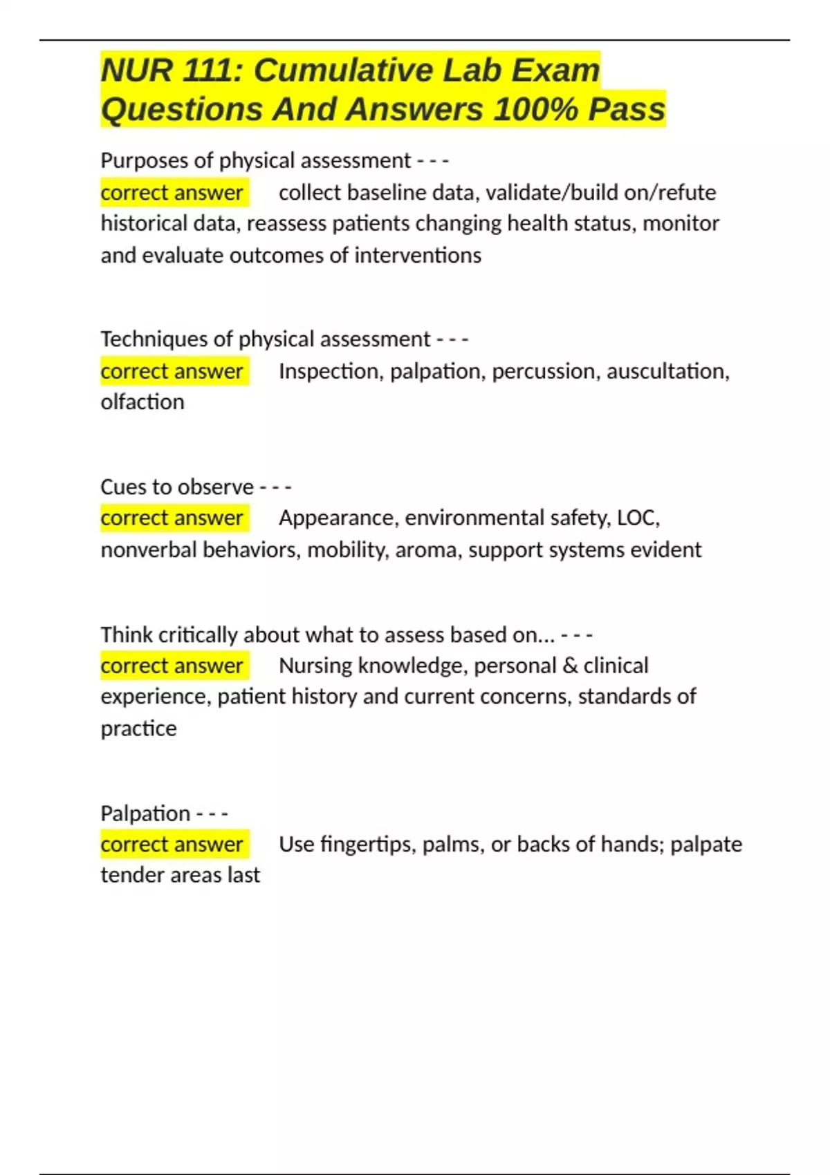 NUR 111 Cumulative Lab Exam Questions And Answers 100- Pass.