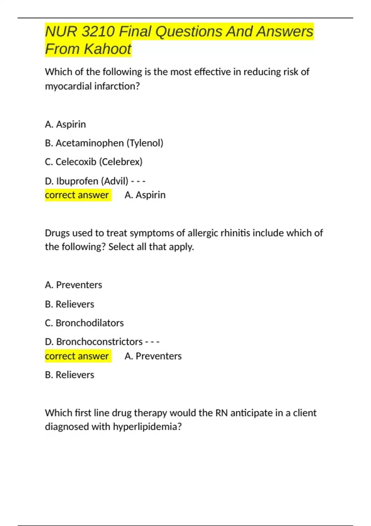 NUR 3210 Final Questions And Answers From Kahoot