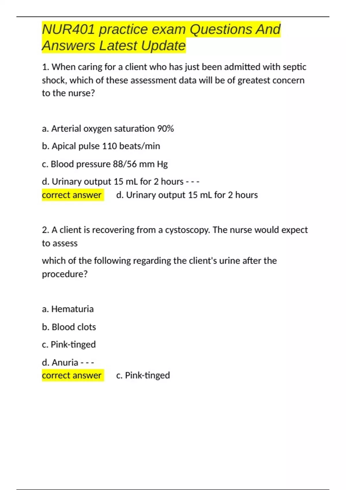 , NUR401 practice exam Questions And