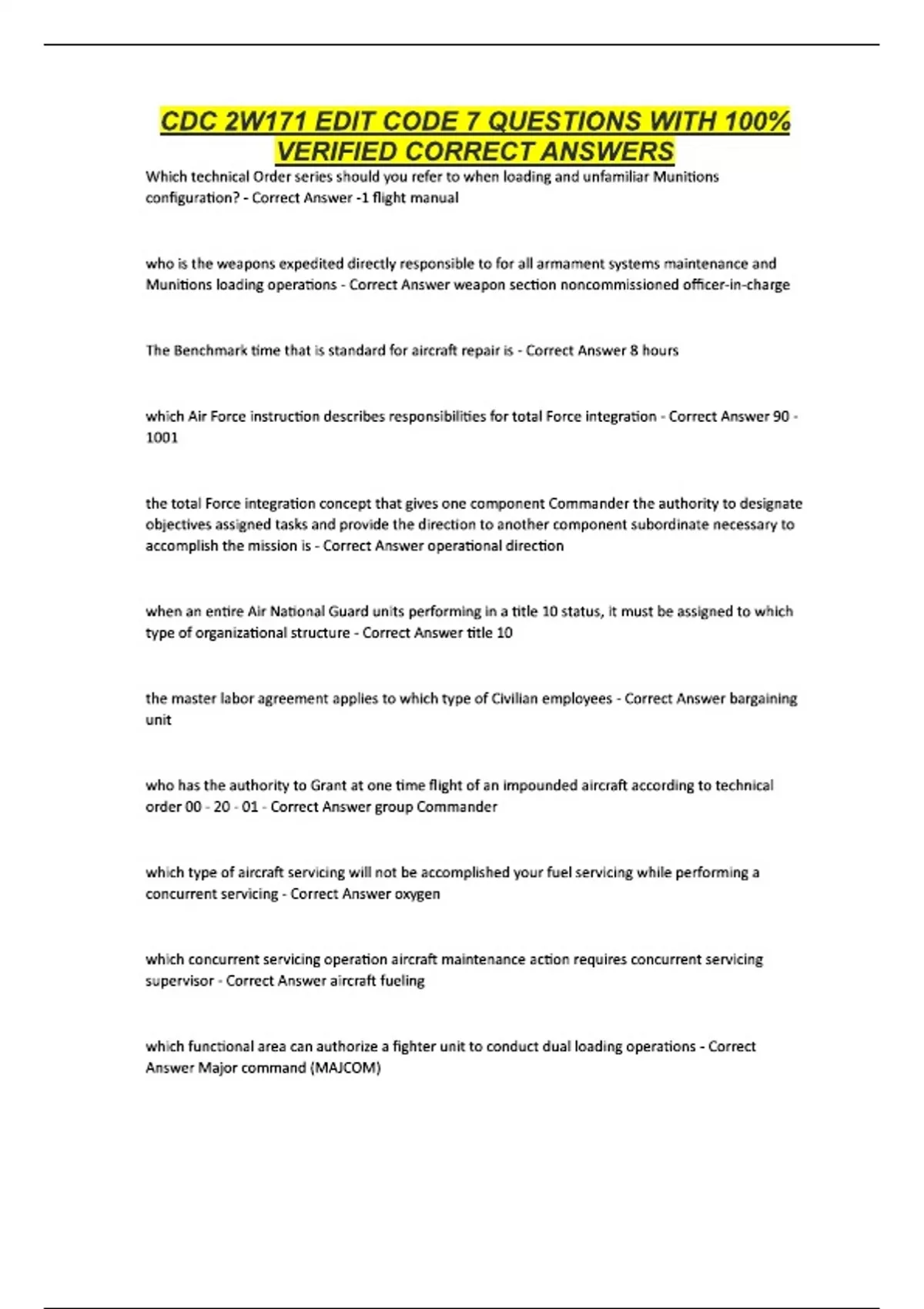 CDC 2W171 EDIT CODE 7 QUESTIONS WITH 100% VERIFIED CORRECT ANSWERS Which technical Order series should you refer to when loading and unfamiliar Munitions configuration? - Correct Answer -1 flight manual who is the weapons expedited directly responsible to for all armament systems maintenance and Munitions loading operations - Correct Answer weapon section noncommissioned officer-in-charge The Benchmark time that is standard for aircraft repair is - Correct Answer 8 hours which Air Force instruction describes responsibilities for total Force integration - Correct Answer 90 - 1001 the total Force integration concept that gives one component Commander the authority to designate objectives assigned tasks and provide the direction to another component subordinate necessary to accomplish the mission is - Correct Answer operational direction when an entire Air National Guard units performing in a title 10 status, it must be assigned to which type of organizational structure - Correct Answer title 10 the master labor agreement applies to which type of Civilian employees - Correct Answer bargaining unit who has the authority to Grant at one time flight of an impounded aircraft according to technical order 00 - 20 - 01 - Correct Answer group Commander which type of aircraft servicing will not be accomplished your fuel servicing while performing a concurrent servicing - Correct Answer oxygen which concurrent servicing operation aircraft maintenance action requires concurrent servicing supervisor - Correct Answer aircraft fueling which functional area can authorize a fighter unit to conduct dual loading operations - Correct Answer Major command (MAJCOM)