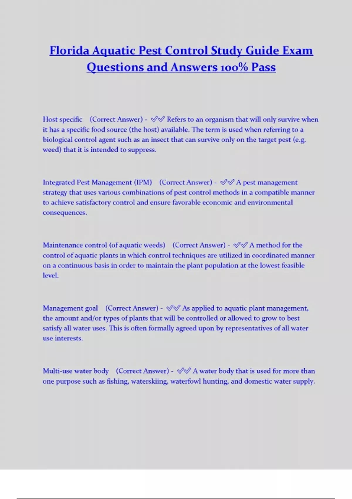 Florida Aquatic Pest Control Study Guide Exam Questions and Answers 100% Pass