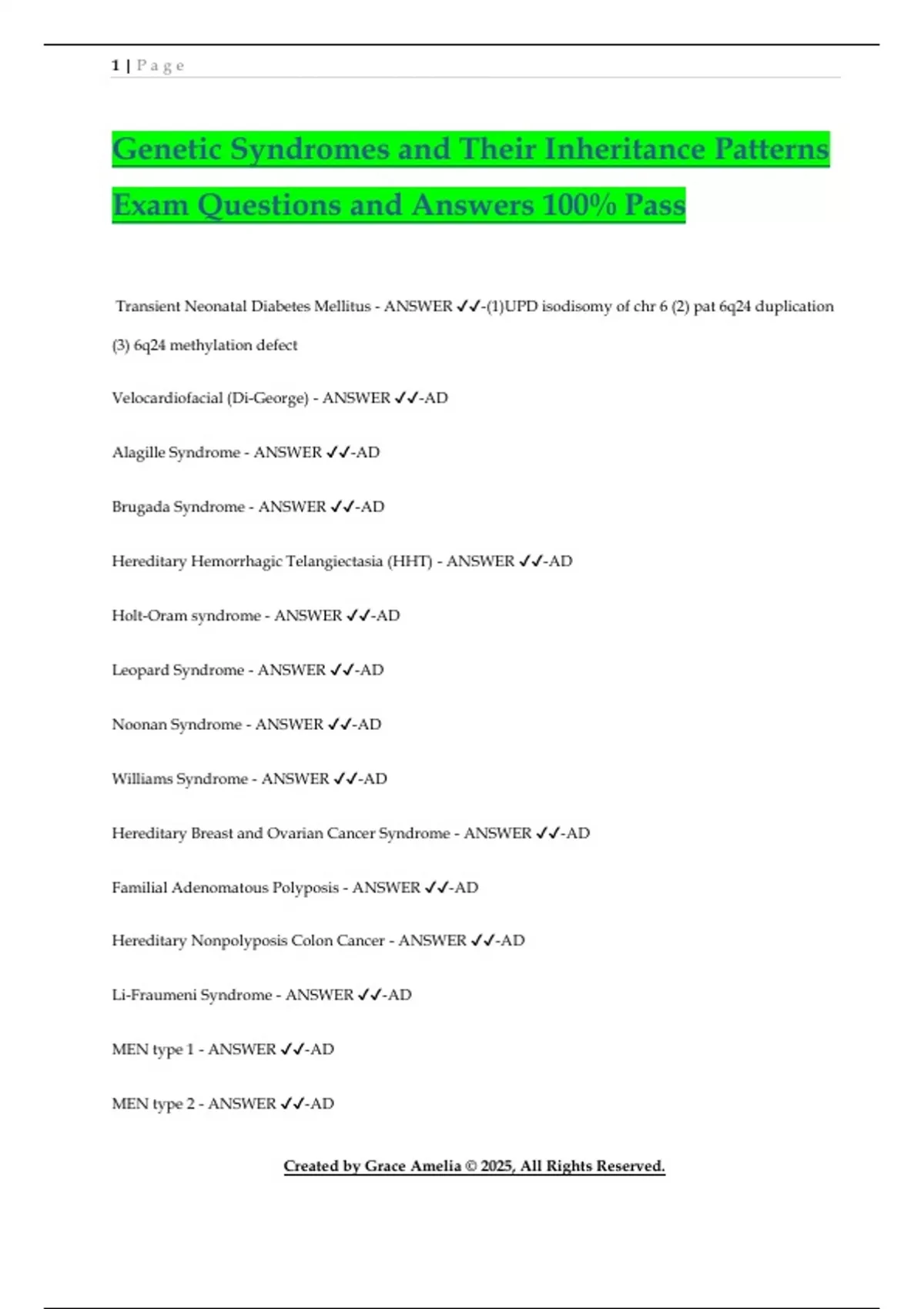 Genetic Syndromes and Their Inheritance Patterns Exam Questions and Answers 100% Pass Transient Neonatal Diabetes Mellitus - ANSWER -(1)UPD isodisomy of chr 6 (2) pat 6q24 duplication (3) 6q24 methylation defect Velocardiofacial (Di-George) - ANSWER -AD Alagille Syndrome - ANSWER -AD Brugada Syndrome - ANSWER -AD Hereditary Hemorrhagic Telangiectasia (HHT) - ANSWER -AD Holt-Oram syndrome - ANSWER -AD Leopard Syndrome - ANSWER -AD Noonan Syndrome - ANSWER -AD Williams Syndrome - ANSWER -AD Hereditary Breast and Ovarian Cancer Syndrome - ANSWER -AD Familial Adenomatous Polyposis - ANSWER -AD Hereditary Nonpolyposis Colon Cancer - ANSWER -AD Li-Fraumeni Syndrome - ANSWER -AD MEN type 1 - ANSWER -AD MEN type 2 - ANSWER -AD 2 | P a g e Created by Grace Amelia © 2025, All Rights Reserved. Neurofibromatosis II - ANSWER -AD Cowden syndrome (Hamartoma tumor syndrome) - ANSWER -AD Tuberous Sclerosis - ANSWER -AD Von-Hippel Lindau Syndrome - ANSWER -AD Xeroderma Pigmentosum - ANSWER -AD Branchio-oto-renal syndrome - ANSWER -AD CHARGE Syndrome - ANSWER -AD Cri-du-Chat - ANSWER -AD Greig Cephalopolysyndactyly (GCPS) - ANSWER -AD Rubenstein-Taybi Syndrome - ANSWER -AD Hidrotic Ectodermal Dysplasia - ANSWER -AD Hereditary Neuropthay with Liability to pressure palsies - ANSWER -AD Myotonic Dystrophy 1 (DM1) - ANSWER -AD Sotos Syndrome - ANSWER -AD Early Onset Familial Alzheimer Disease (EOFAD) - ANSWER -AD CADASIL - ANSWER -AD Neurofibromatosis I - ANSWER -AD Blepharophimosis, Ptosis and Epicanthis inversus (BPES) - ANSWER -AD Waardenburg syndrome - ANSWER -AD