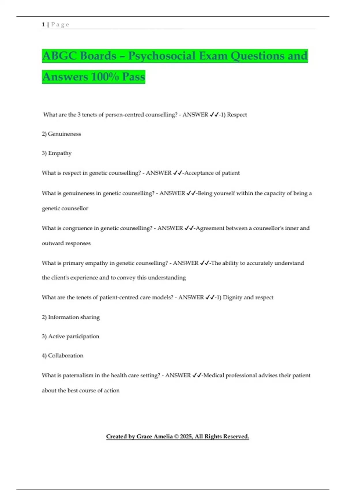 ABGC Boards – Psychosocial Exam Questions and Answers 100% Pass What are the 3 tenets of person-centred counselling? - ANSWER -1) Respect 2) Genuineness 3) Empathy What is respect in genetic counselling? - ANSWER -Acceptance of patient What is genuineness in genetic counselling? - ANSWER -Being yourself within the capacity of being a genetic counsellor What is congruence in genetic counselling? - ANSWER -Agreement between a counsellor's inner and outward responses What is primary empathy in genetic counselling? - ANSWER -The ability to accurately understand the client's experience and to convey this understanding What are the tenets of patient-centred care models? - ANSWER -1) Dignity and respect 2) Information sharing 3) Active participation 4) Collaboration What is paternalism in the health care setting? - ANSWER -Medical professional advises their patient about the best course of action 2 | P a g e Created by Grace Amelia © 2025, All Rights Reserved. What is the concept of nondirectiveness in genetic counselling? - ANSWER -Interacting and working with clients to raise their self-esteem and leave them with greater control over their life and decisions In what aspects might advice giving be appropriate in genetic counselling? - ANSWER -1) Standards of care 2) Medical recommendations 3) Practice guidelines How does a genetic counsellor promote shared language? - ANSWER -Mirror the client's language or communication style What are the two models for genetic counselling described by Kessler? - ANSWER -1) Teaching Model 2) Counselling Model What is the goal of the teaching model? - ANSWER -Educate the client What are the goals of the psychotherapeutic counselling model? - ANSWER -1) Understand the other person 2) Bolster inner sense of competence of other person 3) Promote greater sense of control over their l
