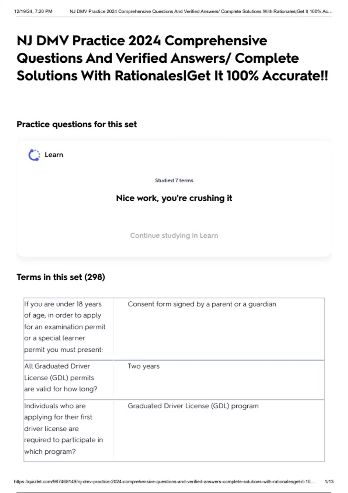 , 12/19/24, 7:20 PM NJ DMV Practice 2024 Comprehensive Questions And Verified Answers/ Complete Solutions With Rationales|Get It 100% Ac…