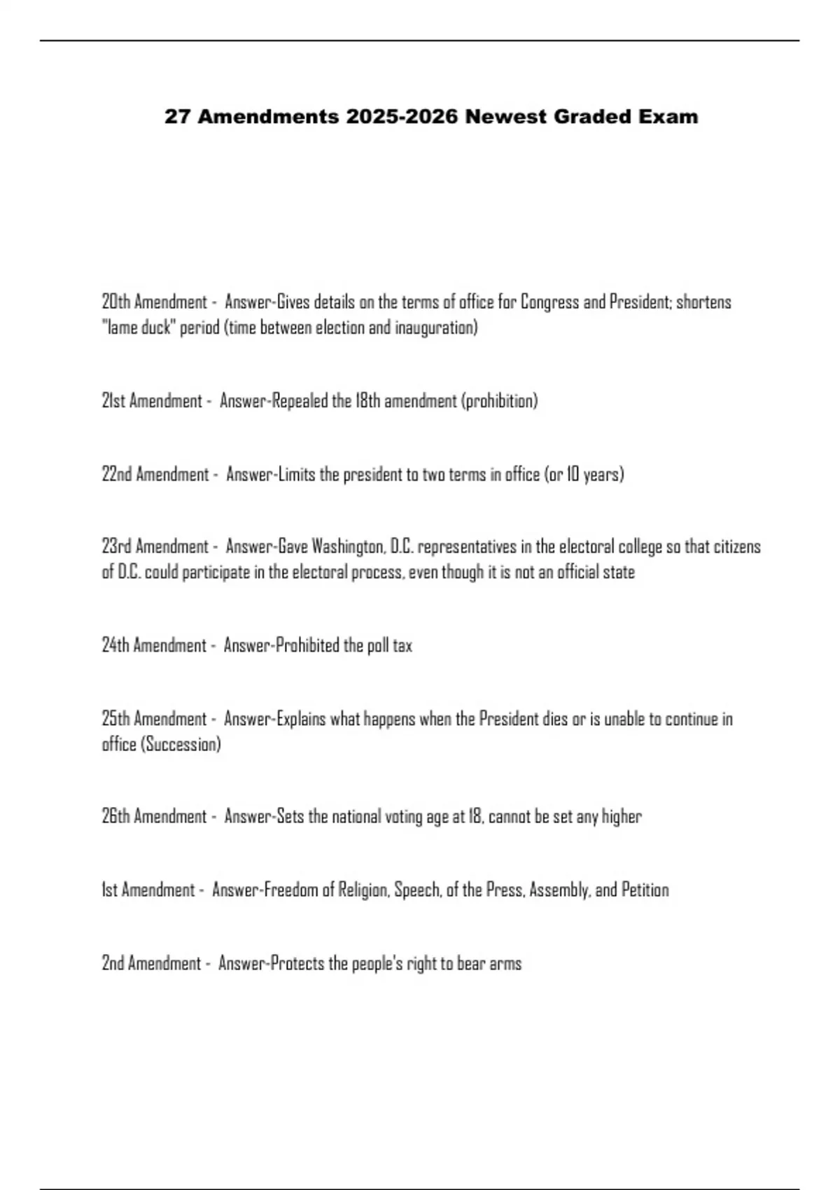26th Amendment - Answer-Sets the national voting age at 18, cannot be set any higher