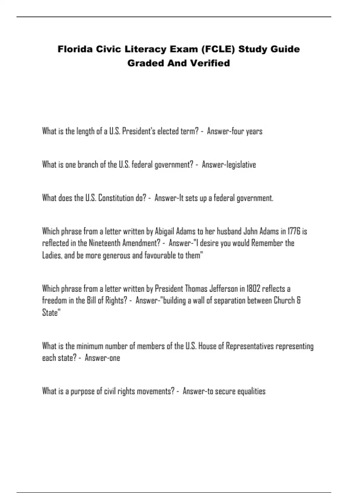 Florida Civic Literacy Exam (FCLE) Study Guide Graded And Verified