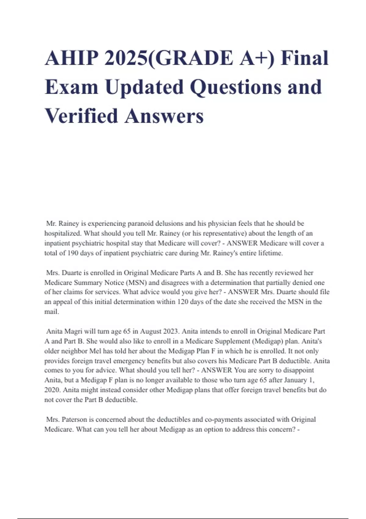 Mr. Rainey is experiencing paranoid delusions and his physician feels that he should be hospitalized. What should you tell Mr. Rainey (or his representative) about the length of an inpatient psychiatric hospital stay that Medicare will cover? - ANSWER Medicare will cover a total of 190 days of inpatient psychiatric care during Mr. Rainey's entire lifetime. Mrs. Duarte is enrolled in Original Medicare Parts A and B. She has recently reviewed her Medicare Summary Notice (MSN) and disagrees with a determination that partially denied one of her claims for services. What advice would you give her? - ANSWER Mrs. Duarte should file an appeal of this initial determination within 120 days of the date she received the MSN in the mail. Anita Magri will turn age 65 in August 2023. Anita intends to enroll in Original Medicare Part A and Part B. She would also like to enroll in a Medicare Supplement (Medigap) plan. Anita's older neighbor Mel has told her about the Medigap Plan F in which he is enrolled. It not only provides foreign travel emergency benefits but also covers his Medicare Part B deductible. Anita comes to you for advice. What should you tell her? - ANSWER You are sorry to disappoint Anita, but a Medigap F plan is no longer available to those who turn age 65 after January 1, 2020. Anita might instead consider other Medigap plans that offer foreign travel benefits but do not cover the Part B deductible. Mrs. Paterson is concerned about the deductibles and co-payments associated with Original Medicare. What can you tell her about Medigap as an option to address this concern? - ANSWER Medigap plans do not cover Original Medicare benefits, but they coordinate with Original Medicare coverage. Mrs. Shields is covered by Original Medicare. She sustained a hip fracture and is being successfully treated for that condition. However, she and her physicians feel that after her lengthy hospital stay, she will need a month or two of nursing and rehabilitative care. What should you tell them about Original Medicare's coverage of care in a skilled nursing facility? - ANSWER Medicare will cover Mrs. Shield's skilled nursing services profided during the first 20 days of her stay, after which she would have a copay until she has been in the facility for 100 days. Mrs. Park is an elderly retiree. Mrs. Park has a low fixed income. What could you tell Mrs. Park that might be of assistance? - ANSWER She should contact her state Medicaid agency to see if she qualifies for one of several programs that can help with Medicare costs for which she is responsible. Mr. Patel is in good health and is preparing a budget in anticipation of his retirement when he turns 66. He wants to understand the health care costs he might be exposed to under Medicare if he were to require hospitalization because of an illness. In general terms, what could you tell him about his costs for inpatient hospital services under Original Medicare? - ANSWER Under Original Medicare there is a single deductible amount due for the first 60 days of any inpatient hospital stay, after which it converts into a per day coinsurance amount up to 60 days over his lifetime, after which he would be responsible for all costs. Mrs. Quinn recently turned 66 and decided after many years of work to retire and begin receiving Social Security benefits. Shortly thereafter Mrs. Quinn received a letter informing her that she had been automatically enrolled in Medicare Part B. She wants to understand what this means. What should you tell Mrs. Quinn? - ANSWER Part B primarily covers physician services. She will be paying a monthly premium and except for many preventative and screening tests, generally will have 20% copayments for these services, in addition to an annual deductible. Mr. Diaz continued working with his company and was insured under his employer's group plan until he reached age 68. He has heard that there is a premium penalty for those who did not sign up for Part B when first eligible and wants to know how much he will have to pay. What should you tell him? - ANSWER Mr. Diaz will not pay any penalty because he had continuous coverage under his employers plan. Mrs. Gonzalez is enrolled in Original Medicare and has a Medigap policy as well, but it provides no drug coverage. She would like to keep the coverage she has but replace her existing Medigap plan with one that provides drug coverage. What should you tell her? - ANSWER Mrs Gonzalex cannot purchase a Medigap plan that covers drugs but she could keep her Medigap policy and enroll in a Part D prescription drug plan. Mr. Xi will soon turn age 65 and has come to you for advice as to what services are provided under Original Medicare. What should you tell Mr. Xi that best describes the health coverage provided to Medicare beneficiaries? - ANSWER Beneficiaries under Original Medicare have no cost sharing for most preventive services. Ms. Brooks has aggressive cancer and would like to know if Medicare will cover hospice services in case she needs them. What should you tell her? - ANSWER Medicare covers hospice services and they will be available for her. Mr. Davis is 52 years old and has recently been diagnosed with end-stage renal disease (ESRD) and will soon begin dialysis. He is wondering if he can obtain coverage under Medicare. What should you tell him? - ANSWER He may sign up for Medicare at any time however coverage usually begins on the fourth month after dialysis treatments start. Mrs. Chen will be 65 soon, has been a citizen for twelve years, has been employed full time, and paid taxes during that entire period. She is concerned that she will not qualify for coverage under part A because she was not born in the United States. What should you tell her? - ANSWER Most individuals who are citizens and age 65 or over are covered under Part A by virtue of having paid Medicare taxes while working though some may be covered as a result of paying monthly premiums. Mrs. West wears glasses and dentures and 