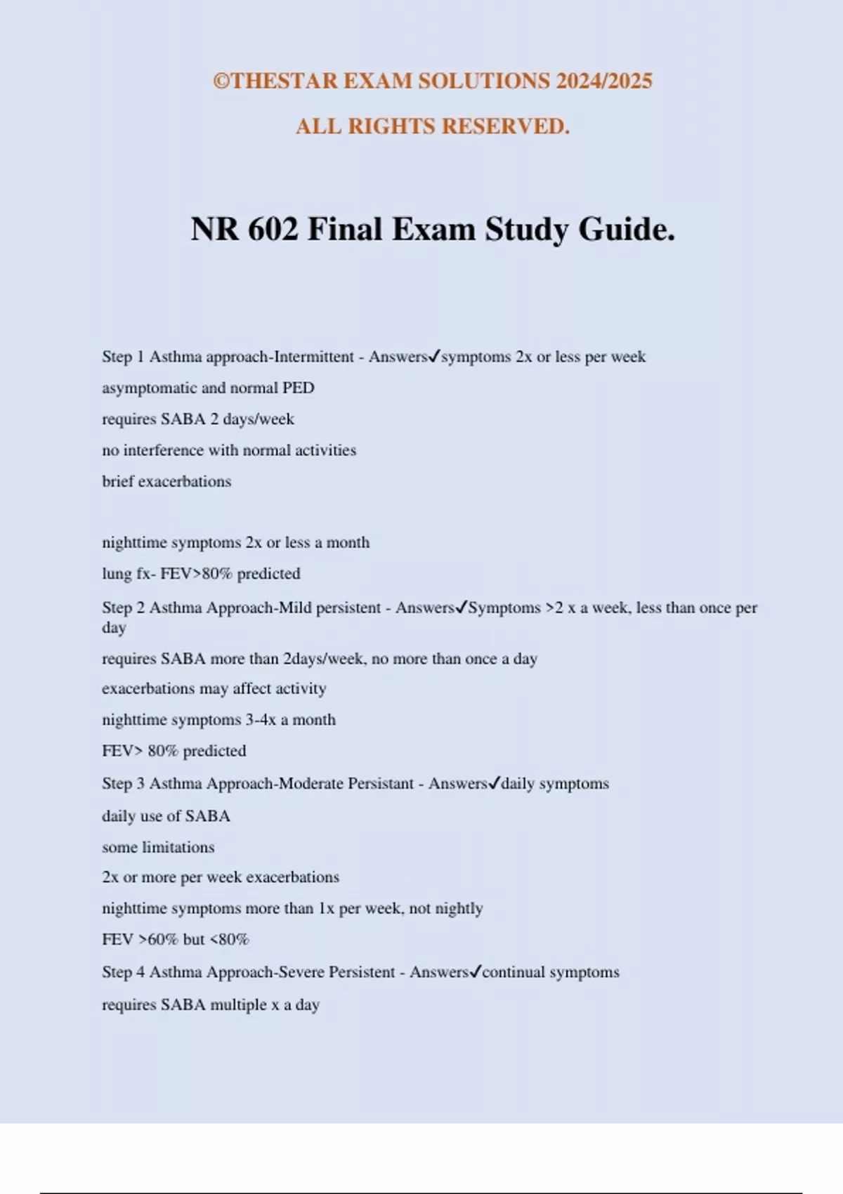 ©THESTAR EXAM SOLUTIONS 2024/2025 ALL RIGHTS RESERVED. NR 602 Final Exam Study Guide. Step 1 Asthma approach-Intermittent - Answerssymptoms 2x or less per week asymptomatic and normal PED requires SABA 2 days/week no interference with normal activities brief exacerbations nighttime symptoms 2x or less a month lung fx- FEV>80% predicted Step 2 Asthma Approach-Mild persistent - AnswersSymptoms >2 x a week, less than once per day requires SABA more than 2days/week, no more than once a day exacerbations may affect activity nighttime symptoms 3-4x a month FEV> 80% predicted Step 3 Asthma Approach-Moderate Persistant - Answersdaily symptoms daily use of SABA some limitations 2x or more per week exacerbations nighttime symptoms more than 1x per week, not nightly FEV >60% but <80% Step 4 Asthma Approach-Severe Persistent - Answerscontinual symptoms requires SABA multiple x a day ©THESTAR EXAM SOLUTIONS 2024/2025 ALL RIGHTS RESERVED. extremely limited activity nighttime symptoms 7x a week FEV <60% Tx of asthma - AnswersStepwise approach step 1: SABA PRN step 2: low dose ICS Step 3: low dose ICS+ LABA or medium dose ICS step 4: Medium dose ICS+LABA Step 5: high dose ICS+ LABA Step 6: High dose ICS+LABA + corticosteroid Step 6 Asthma Approach - Answers Bulbar/palpebral conjunctival infection - AnswersMay be unilateral or bilateral Leukocoria - Answersabnormal appearance of a white film in the pupil; immediate referral to pediatric ophthalmologist warranted Causes: retinal detachment, cataract, retinal dysplasia, newborn retinoblastoma Visual screening in children - AnswersAt least once between ages 3-5 y/o according to USPSTF AOM - AnswersRF: genetics, males, Native American, siblings, low economic status, ages 6mo-3y, winter, supine bottle feeding, daycare, tobacco smoke S/S of AOM - Answerserythema, otalgia, bulging TM, absent cone of light Dx of AOM - AnswersAudiometry, tympanometry, possible lateral neck xray to r/o mass TX of AOM - Answersuncomplicated: supportive with tylenol/ibuprofen; watchful waiting 48- 72 in 6m-2y/o; <5 benzocaine otic drops 1st line antx: amoxicillin 80-90mg/kg/day Q12 x 10days if allergy to PCN- augmentin, cefuroxime Bacterial rhinosinusitis - AnswersPreceded by URI-typically worsens after 5-7 days- not resolved in 2 weeks Sx of bacterial rhinosinusitis - AnswersPurulant nasal congestion, drainage, facial pain, headache, fever