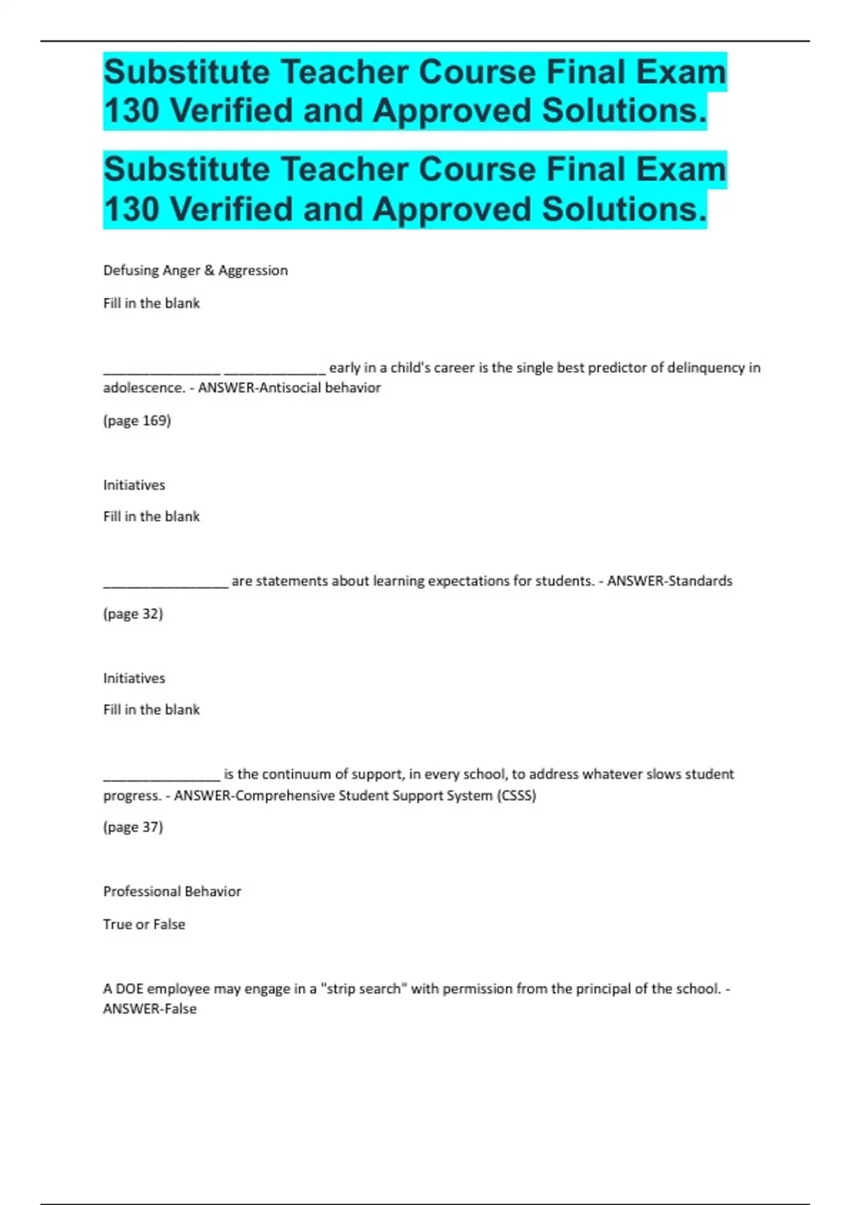Substitute Teacher Course Final Exam 130 Verified and Approved Solutions.