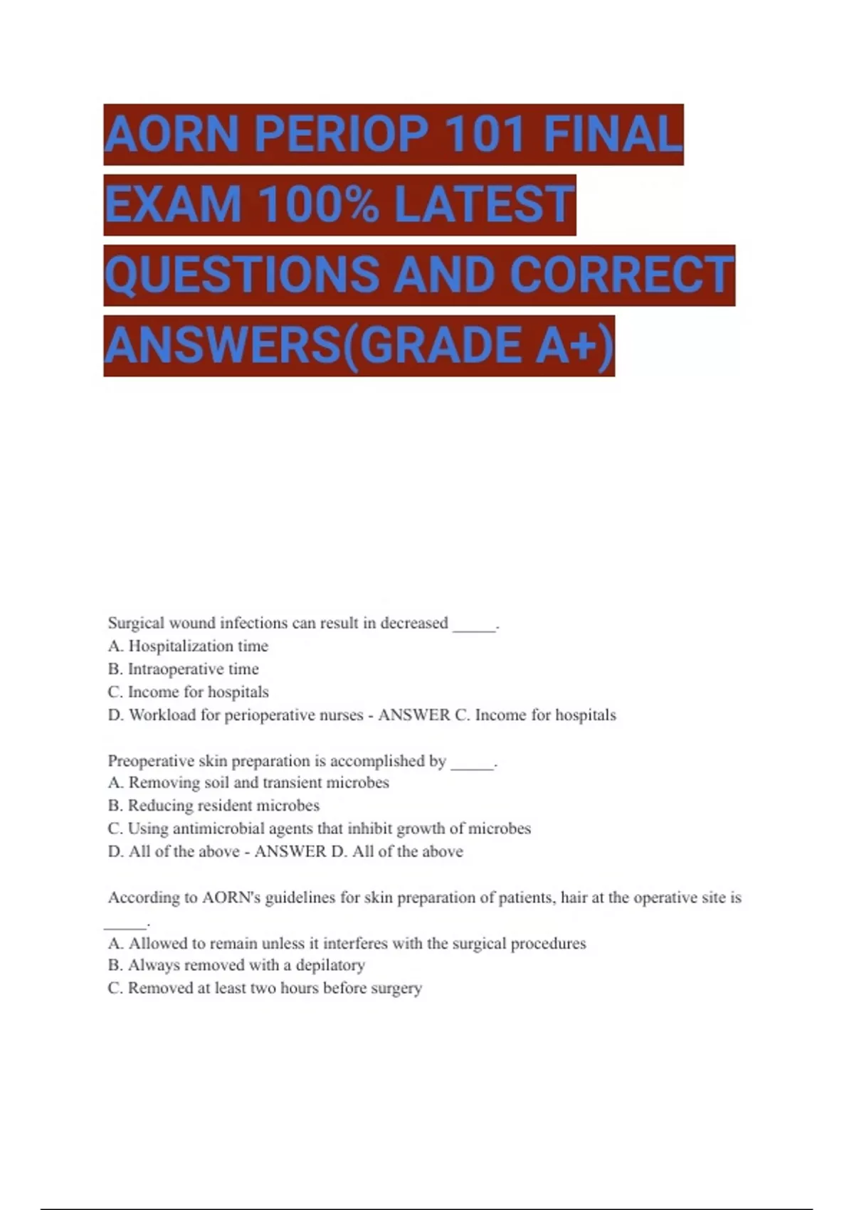 Surgical wound infections can result in decreased _____. A. Hospitalization time B. Intraoperative time C. Income for hospitals D. Workload for perioperative nurses - ANSWER C. Income for hospitals Preoperative skin preparation is accomplished by _____. A. Removing soil and transient microbes B. Reducing resident microbes C. Using antimicrobial agents that inhibit growth of microbes D. All of the above - ANSWER D. All of the above According to AORN's guidelines for skin preparation of patients, hair at the operative site is _____. A. Allowed to remain unless it interferes with the surgical procedures B. Always removed with a depilatory C. Removed at least two hours before surgery D. Dry shaved as opposed to wet shaved - ANSWER A. Allowed to remain unless it interferes with the surgical procedures The concept of prepping from clean to dirty means _____. A. Cleaning all stomas or open wounds first B. Beginning at the incision site and using circular strokes toward the periphery C. Prep solution is changed after cleaning contaminated areas D. Surgical scrub solutions used first and then surgical paint - ANSWER B. Beginning at the incision site and using circular strokes toward the periphery Common resident bacteria include all EXCEPT: A. Staphylococcus epiermidis B. Staphylococcus aureus C. Diphtheroid bacillus D. Pseudomonas aeruginosa - ANSWER wrong Which one of the following statements about the skin prep is FALSE? A. Povidone-iodine should not be allowed to dry B. Manufacturers' guidelines should be followed C. Skin prep is performed after the patient has been positioned D. The name of the person performing the prep should be documented - ANSWER A. Povidone-iodine should not be allowed to dry Objectives of the surgical prep include all EXCEPT: A. Removal of dirt, skin oil, and microbes from the skin B. Sterilization of skin C. Reduction of bacterial count D. Prevention of regrowth of microbes for several hours - ANSWER B. Sterilization of skin The generally recognized length of time required for contact of antimicrobial agents to be effective is A. 1 to 3 minutes B. 2 to 5 minutes C. 3 to 5 minutes D. According to manufacturers' directions - ANSWER D. According to manufacturers' directions The principles of preoperative skin preparation include all of the following EXCEPT: A. Prep from clean to dirty B. Use aseptic technique C. Prep stomas first D. Prevent pooling - ANSWER C. Prep stomas first Which one of the following topical antimicrobial agents is neurotoxic? A. Povidone-iodine B. Alcohol C. PCMX (parachlorometaxylenol) D. Chlorhexidine gluconate - ANSWER D. Chlorhexidine gluconate Which statement is TRUE about iodophor with alcohol? A. It provides rapid reduction in microbial counts of skin B. Persistence or residual activity is excellent C. It has been shown to be nontoxic and nonirritating D. Percutaneous absorption does not occur across mucous membranes - ANSWER wrong Which statement is FALSE about eye, extremity, or vaginal preps? A. A 5% sterile ophtalmic prep solution is commercially available for eye preps B. The vagina should be prepped first as part of a vaginal prep C. When prepping an extremity, it should be positioned so that the incision site is the upper-most portion of the prep D. If fingers or toes are included in the surgical field (extremity prep), it may be necessary to scrub the nail with a brush and soap solution - ANSWER B. The vagina should be prepped first as part of a vaginal prep Hand hygiene should be performed after which of the following? A. Touching the operating room bed controls B. Adjusting a patient's bed linens C. Eating D. Marking the surgical site E. All of the above - ANSWER E. All of the above When should perioperative team members use an alcohol-based rub for hand hygiene? A. After hands have been exposed to blood or other bodily fluids B. After using the restroom C. When the hands are not visibly soiled D. When caring for patients with spore-forming organisms - ANSWER C. When the hands are not visibly soiled What is the minimum length of time perioperative team members should spend performing hand hygiene by washing with soap and water?