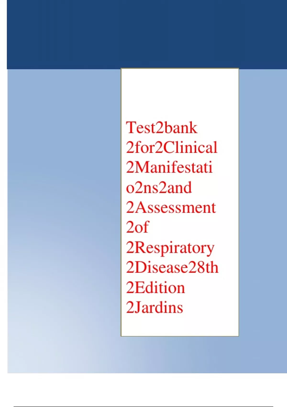 Test Bank for Clinical Manifestations and Assessment of Respiratory Disease 8th Edition by Des Jardins PART 1: Assessment of Cardiopulmonary Disease SECTION I: Bedside Diagnosis 1. The Patient Interview 2. The Physical Examination 3. The Pathophysiologic Basis for Common Clinical Manifestations SECTION II: CLINICAL DATA OBTAINED FROM LABORATORY TESTS AND SPECIAL PROCEDURES—Objective Findings 4. Pulmonary Function Testing 5. Blood Gas Assessment 6. Assessment of Oxygenation 7. Assessment of the Cardiovascular System 8. Radiologic Examination of the Chest 9. Other Important Tests and Procedures SECTION III: THE THERAPIST-DRIVEN PROTOCOL PROGRAM—THE ESSENTIALS 10. The Therapist-Driven Protocol Program 11. Respiratory Insufficiency, Respiratory Failure and Ventilatory Management Protocols 12. Recording Skills and Intra-Professional Communication PART II: Obstructive Lung Disease 13. Chronic Obstructive Pulmonary Disease, Chronic Bronchitis and Emphysema 14. Asthma 15. Cystic Fibrosis 16. Bronchiectasis PART III: Loss of Alveolar Volume 17. Atelectasis PART IV: Infectious Pulmonary Disease 18. Pneumonia, Lung Abscess Formation and Important Fungal Diseases 19. Tuberculosis PART V: Pulmonary Vascular Disease 20. Pulmonary Edema 21. Pulmonary Vascular Disease: Pulmonary Embolism and Pulmonary Hypertension PART VI: Chest and Pleural Trauma 22. Flail Chest 23. Pneumothorax PART VII: Disorders of the Pleura and of the Chest Wall 24. Pleural Effusion and Empyema 25. Kyphoscoliosis PART VIII: Lung Cancer 26. Cancer of the Lung: Prevention and Palliation PART IX: Environmental Lung Diseases 27. Interstitial Lung Diseases PART X: Diffuse Alveolar Disease 28. Acute Respiratory Distress Syndrome PART XI: Neuro-Respiratory Disorders 29. Guillain-Barre Syndrome 30. Myasthenia Gravis 31. Respiratory Insufficiency in the Patient with Neuro-Respiratory Disease PART XII: Sleep-Related Breathing Disorders 32. Sleep Apnea PART XIII: Newborn and Early Childhood Cardiopulmonary Disorders 33. The Newborn Disorders 34. Pediatric Assessment, Protocols, and PALS Management 35. Meconium Aspiration Syndrome 36. Transient Tachypnea of the Newborn 37. Respiratory Distress Syndrome 38. Pulmonary Air Leak Syndrome 39. Respiratory Syncytial Virus Infection (Bronchiolitis) 40. Chronic Lung Disease of Infancy 41. Congenital Diaphragmatic Hernia 42. Congenital Heart Disease 43. Croup and Croup-like Syndromes: Laryngotracheobronchitis, Bacterial Tracheitis and Acute Epiglottitis PART XIV: Other Important Topics 44. Near Drowning/Wet Drowning 45. Smoke Inhalation, Thermal Injuries, and Carbon Monoxide IntoxicationTentative (based on current edition)